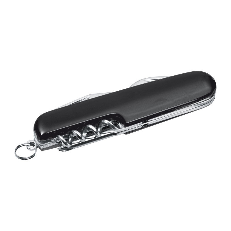 Hét részes kombinált zsebkés, alumíniumból. Üvegnyitó, dugóhúzó és egyéb fontos eszközöket találhat meg benne, mindez kulcstartóként használható.