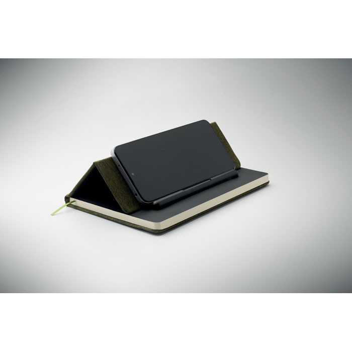 A5 jegyzetfüzet RPET keménytáblás borítóval, telefontámasz funkcióval. Integrált 2 az 1-ben tintamentes és normál golyóstoll ABS-ből. Cérnafűzött. 192 vonalas oldal (96 lap) újrahasznosított papírból. Színben illeszkedő zárópánt és könyvjelző szalag.