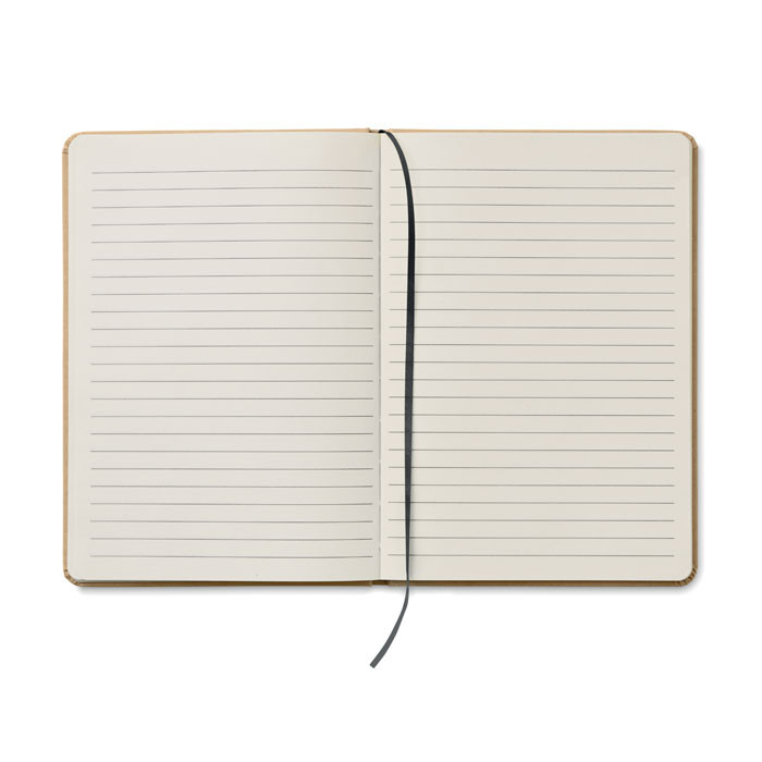 A5 jegyzetfüzet keménytáblás, újrahasznosított karton borítóval. Cérnafűzött. 160 vonalas oldal (80 lap) újrahasznosított papírból. Elasztikus zárópánt, tolltartó hurok és könyvjelző szalag. Nyomógombos golyóstoll újrahasznosított papír tolltesttel. Kéken író betét.