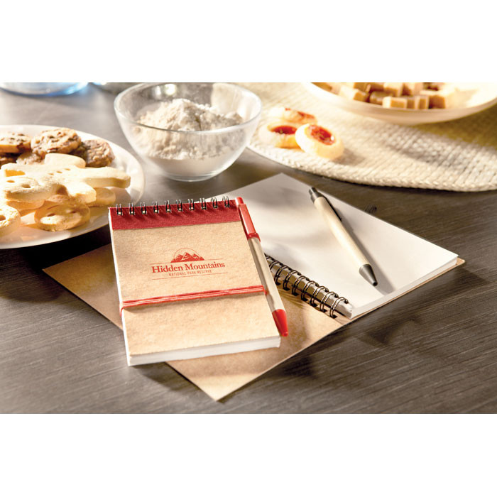 A6 újrahasznosított papírból készült jegyzetfüzet, hozzáillő tollal. Ikerspirálozott. 140 sima oldal (70 lap) újrahasznosított papírból. Illeszkedő színű elasztikus zárópánt és tolltartó hurok. Nyomógombos golyóstoll újrahasznosított karton tolltesttel, színben illeszkedő, biológiailag lebomló műanyag szerelvényekkel. Kéken író betéttel. FSC®- certified | FSC MIX CREDIT, P7.1, FSC-C213206