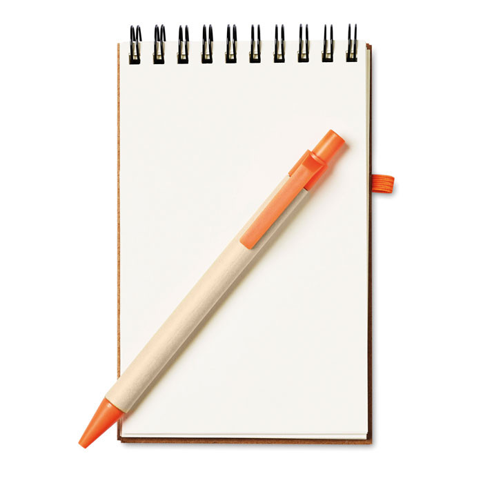A6 újrahasznosított papírból készült jegyzetfüzet, hozzáillő tollal. Ikerspirálozott. 140 sima oldal (70 lap) újrahasznosított papírból. Illeszkedő színű elasztikus zárópánt és tolltartó hurok. Nyomógombos golyóstoll újrahasznosított karton tolltesttel, színben illeszkedő, biológiailag lebomló műanyag szerelvényekkel. Kéken író betéttel. FSC®- certified | FSC MIX CREDIT, P7.1, FSC-C213206