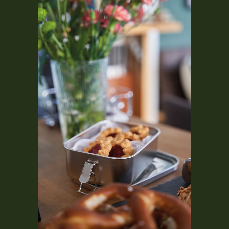 Robusztus, tartós, környezetbarát ételtartó vagy uzsonnás doboz alumíniumból. A két oldalon lévő csattal jól zárható, így biztonságosan szállítható az étel benne.