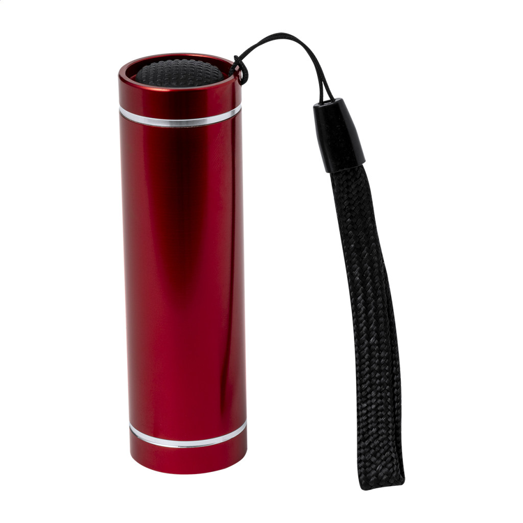 Újrahasznosított alumínium zseblámpa 1 LED-del és hordszíjjal. 3 db AAA elemmel működik, elem nélkül szállítjuk.