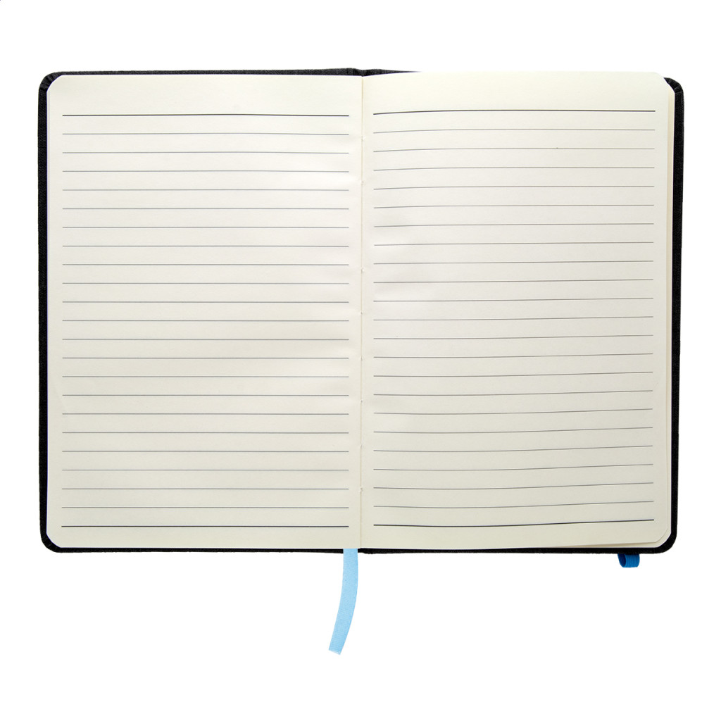 PU bőrrel borított jegyzetfüzet megegyező színű könyvjelzővel, gumiszalaggal és tolltartóval. 96 vonalas lappal, A5 méret.