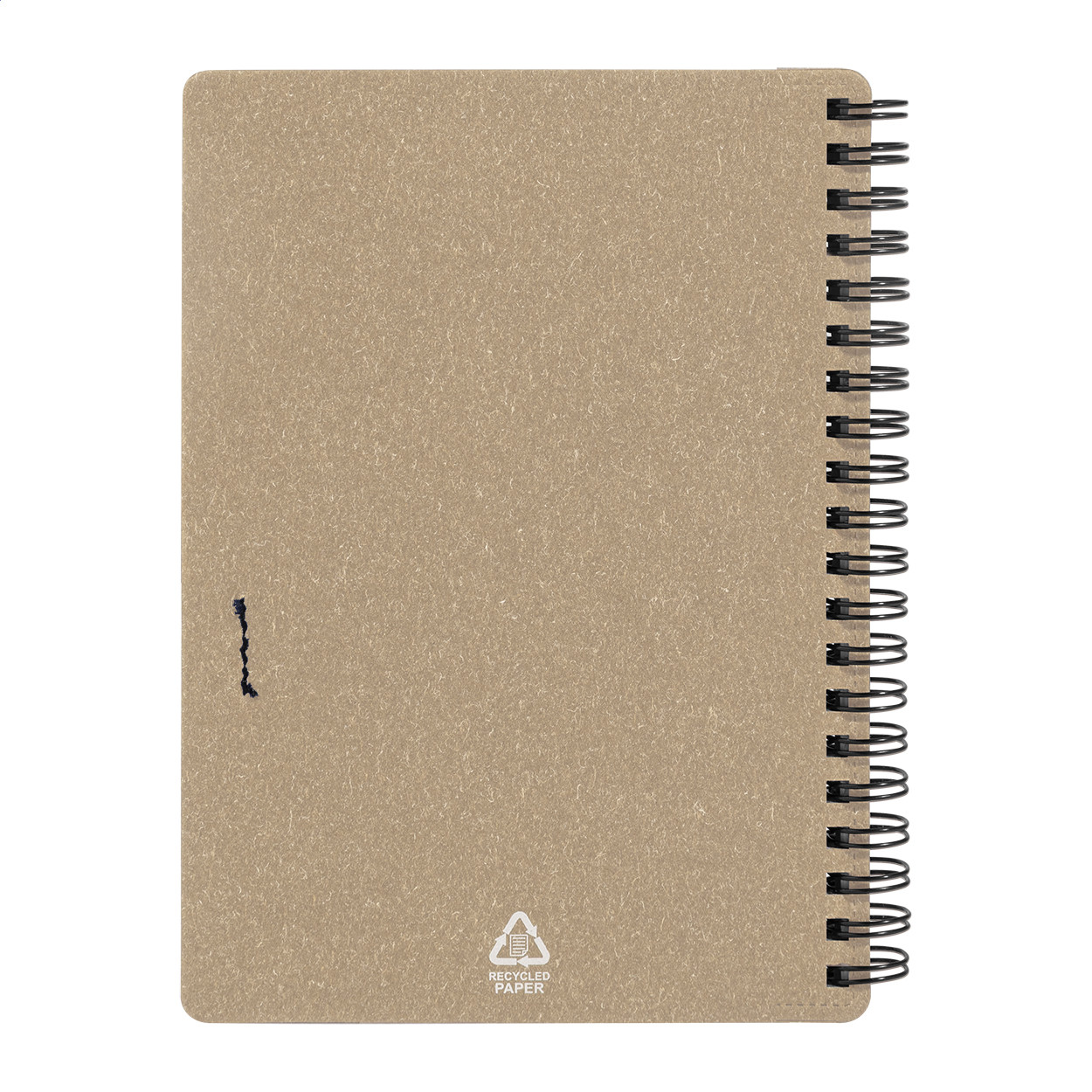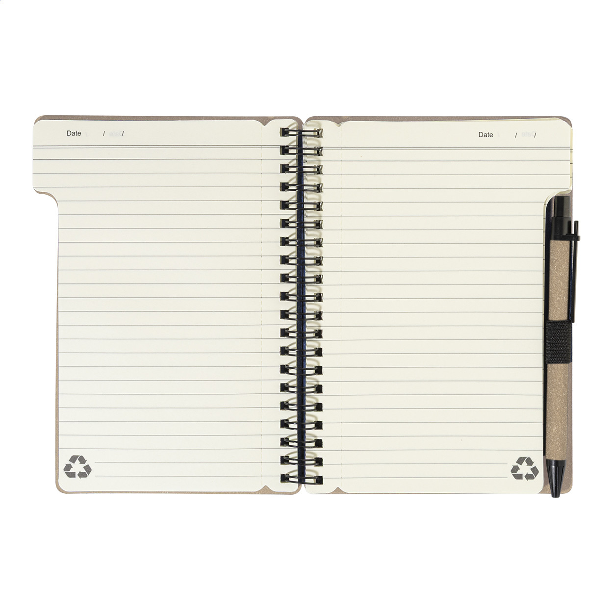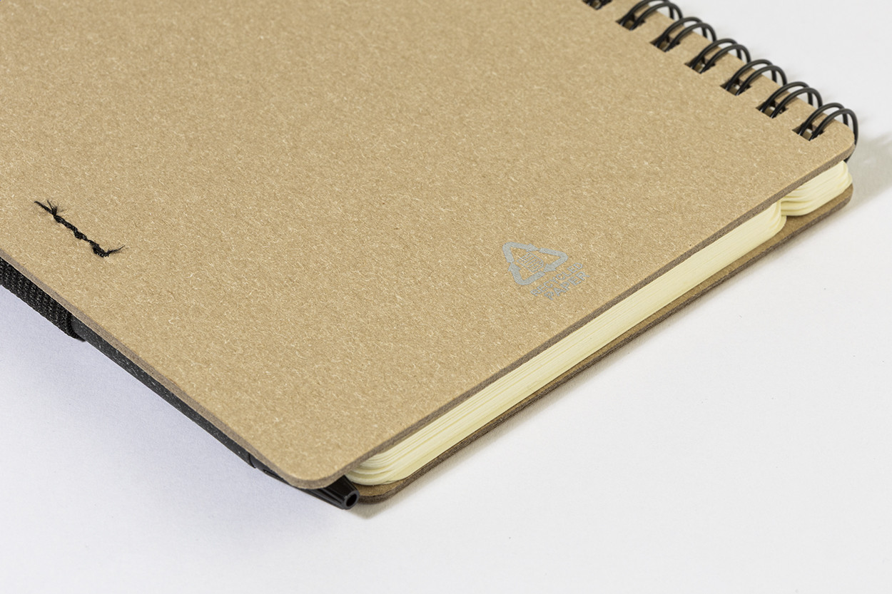 Újrahasznosított papír spirál jegyzetfüzet 80 vonalas lappal. A6 méretű. Tartalmaz egy újrahasznosított papír és újrahasznosított PP anyagú golyóstollat ​​kék tollbetéttel.
