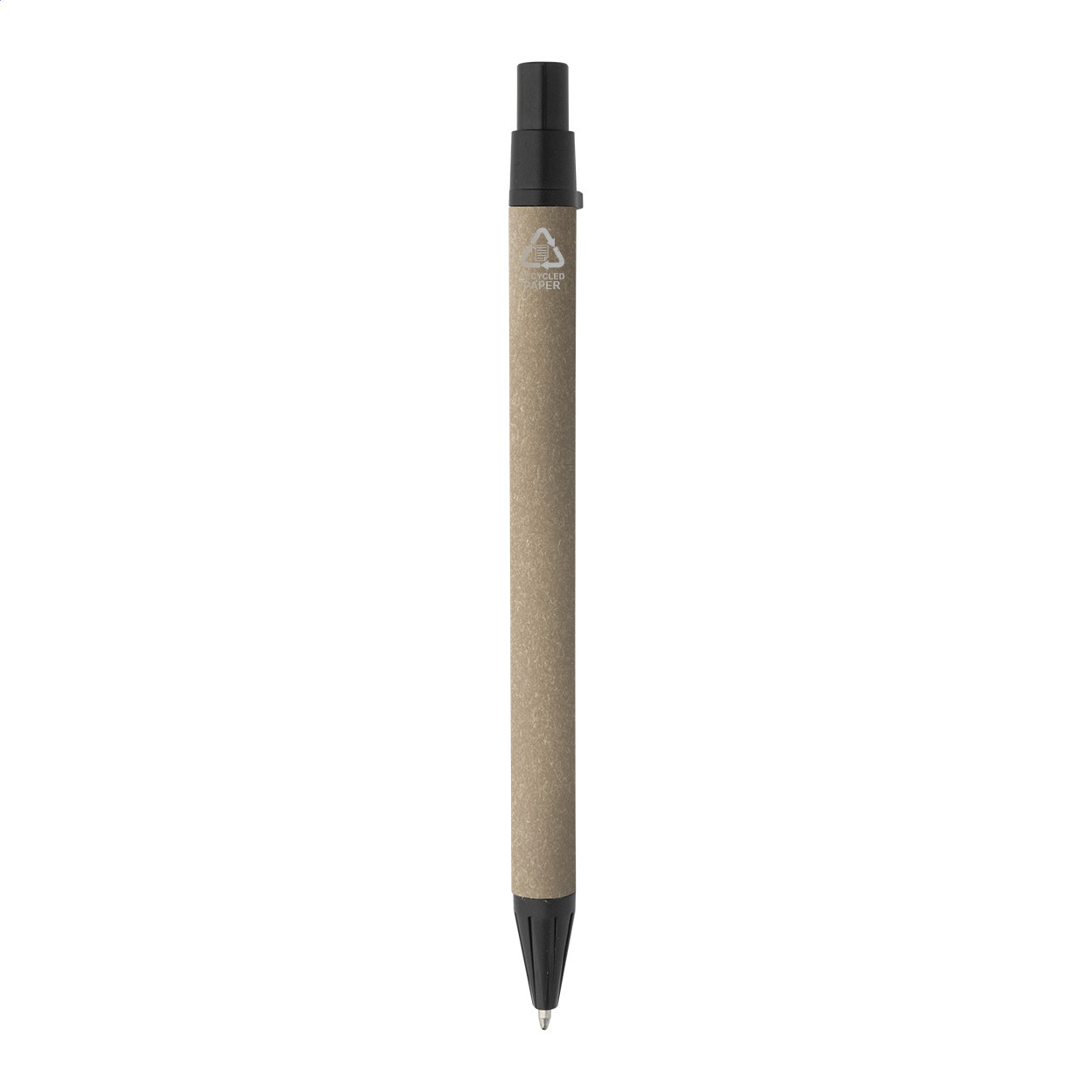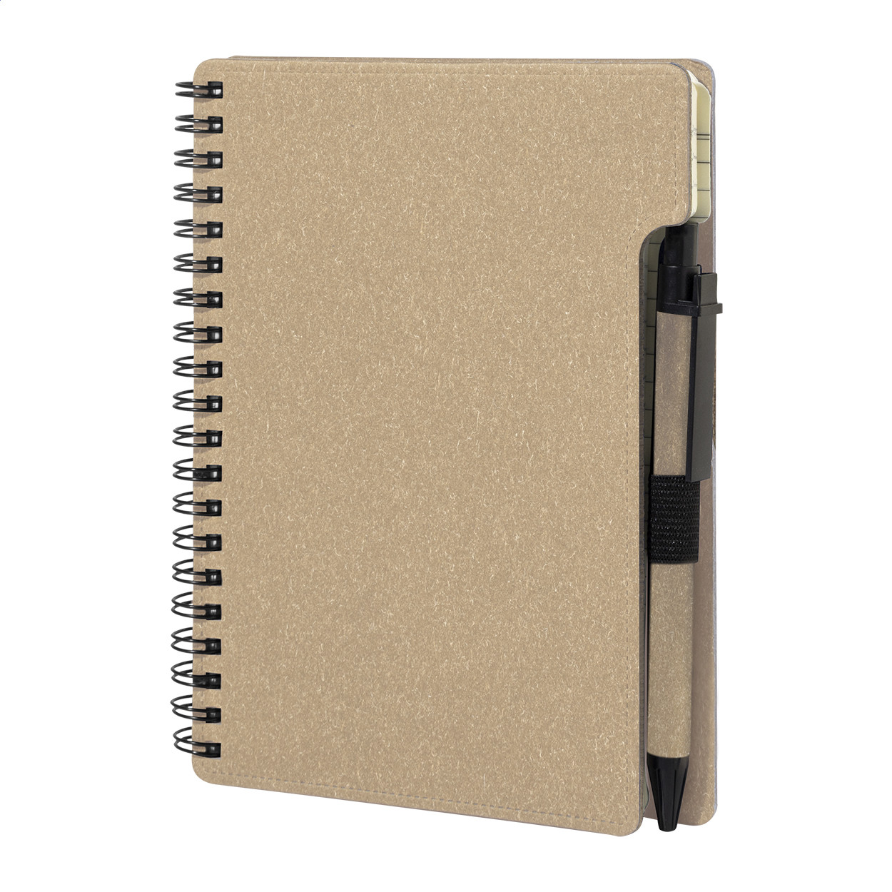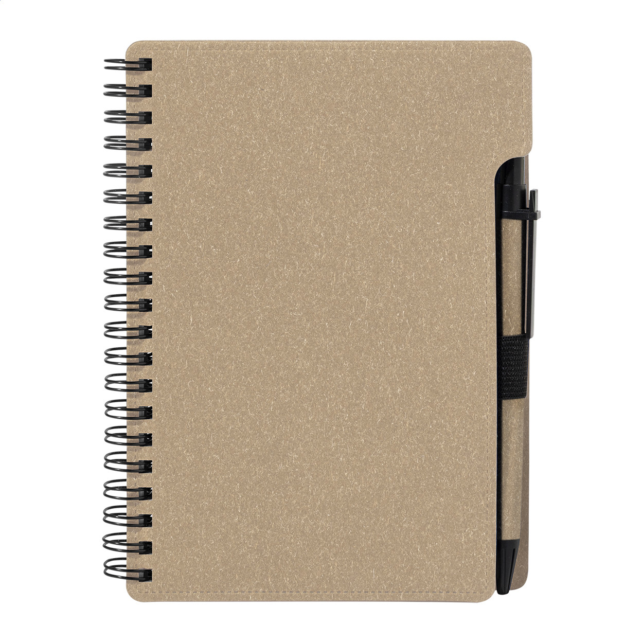 Újrahasznosított papír spirál jegyzetfüzet 80 vonalas lappal. A6 méretű. Tartalmaz egy újrahasznosított papír és újrahasznosított PP anyagú golyóstollat ​​kék tollbetéttel.