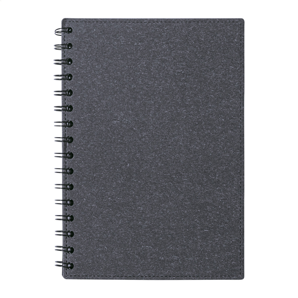 Újrahasznosított papír spirálfüzet, kemény borítással. 80 vonalas A5 méretű lappal.