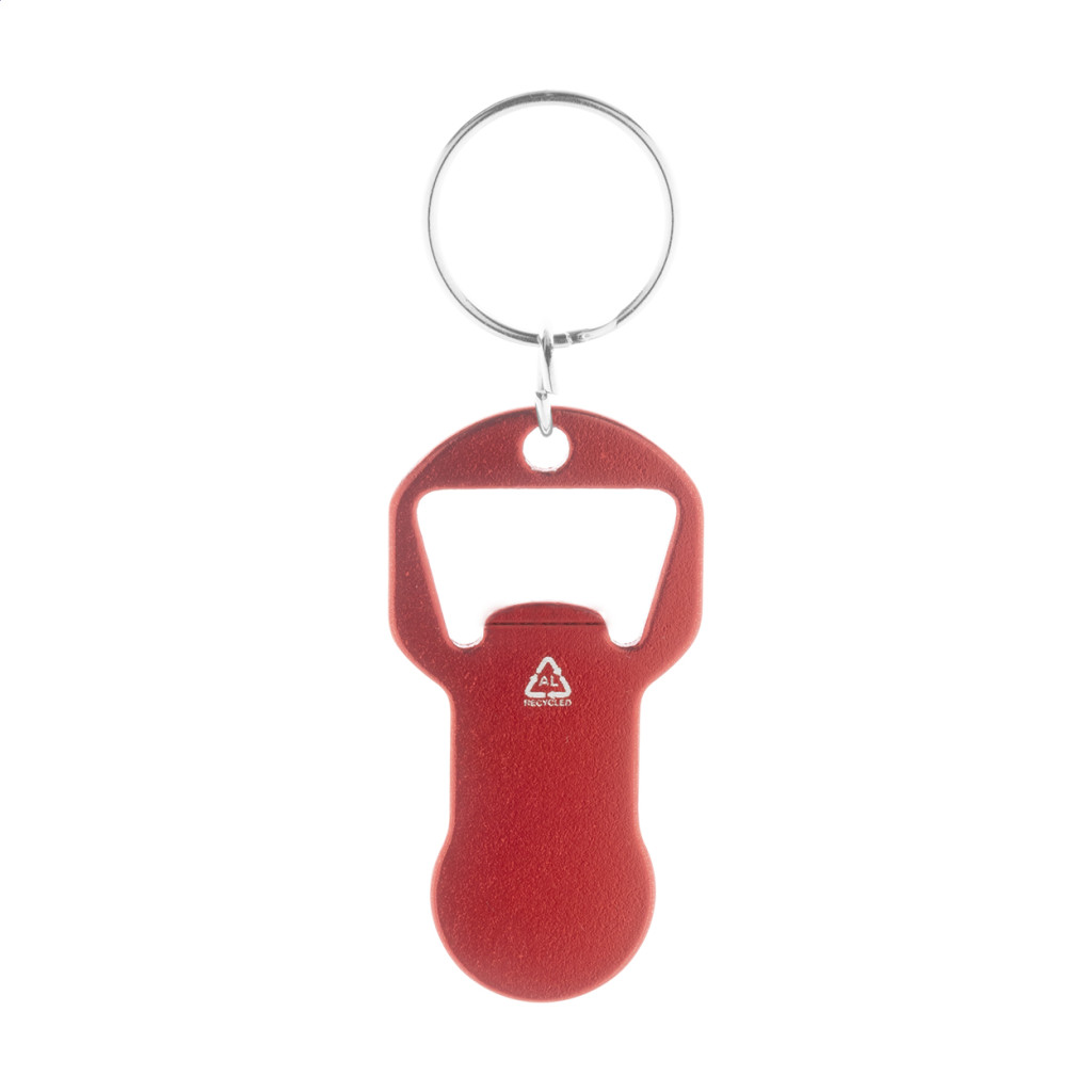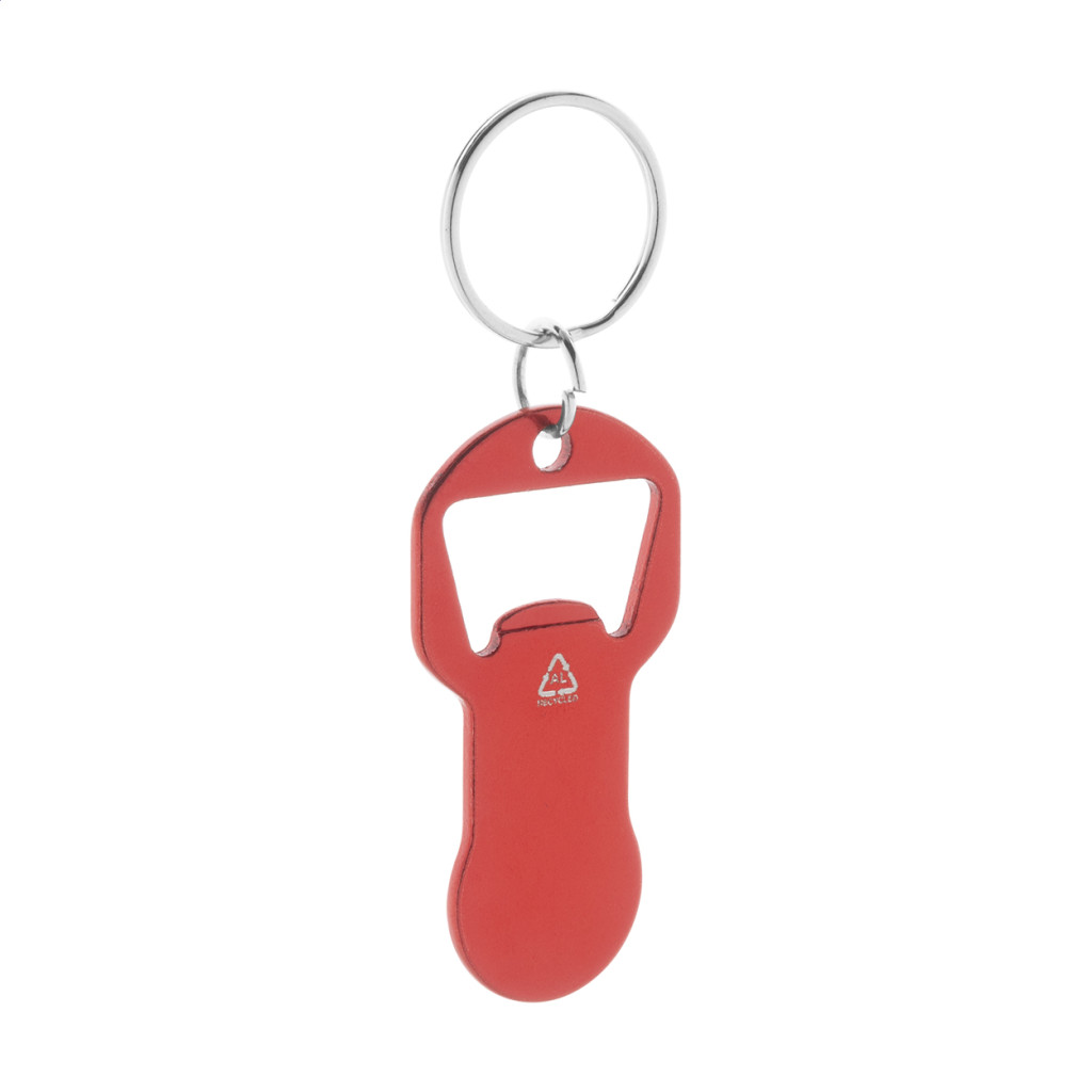 Újrahasznosított alumínium üvegnyitós kulcstartó bevásárlókocsi érmével.