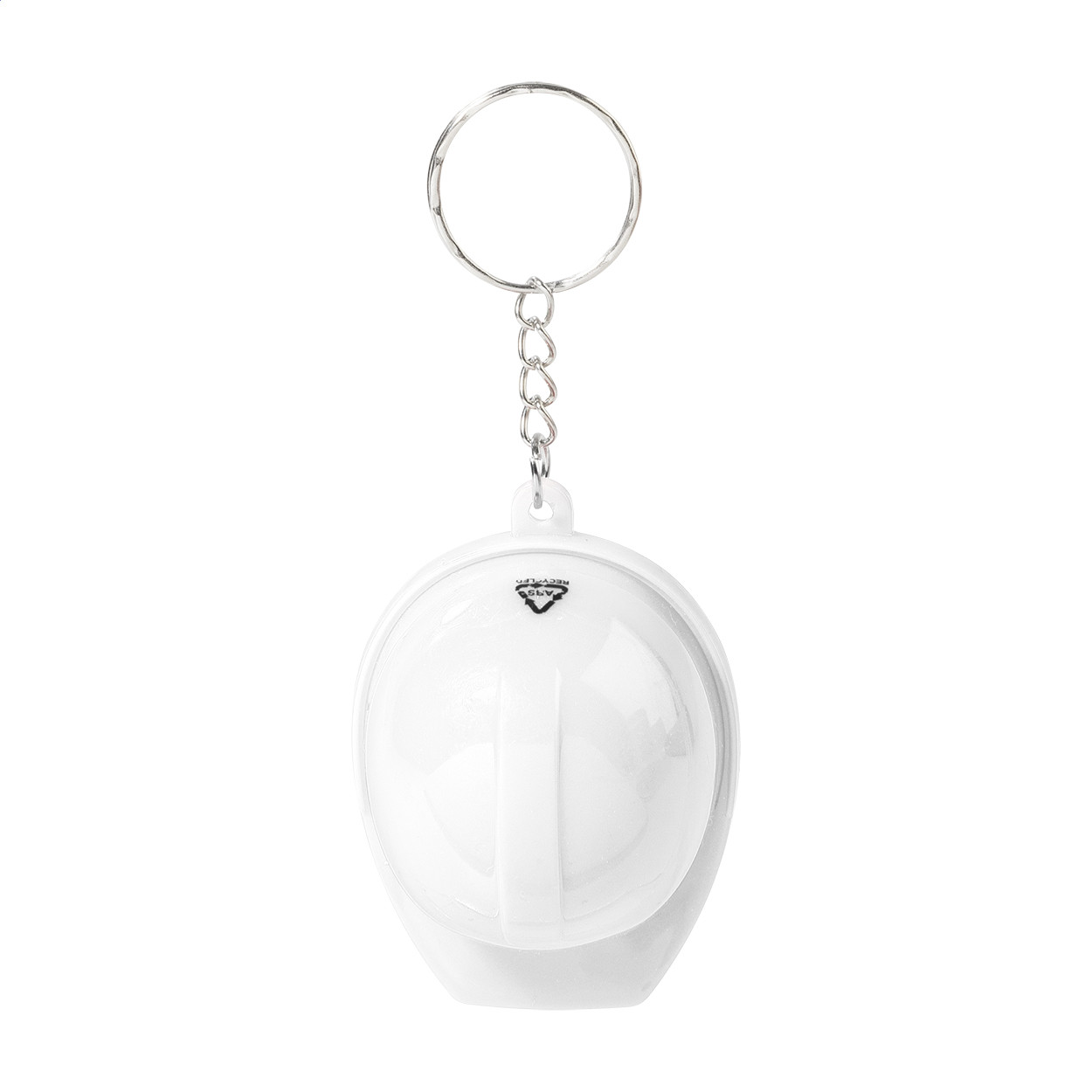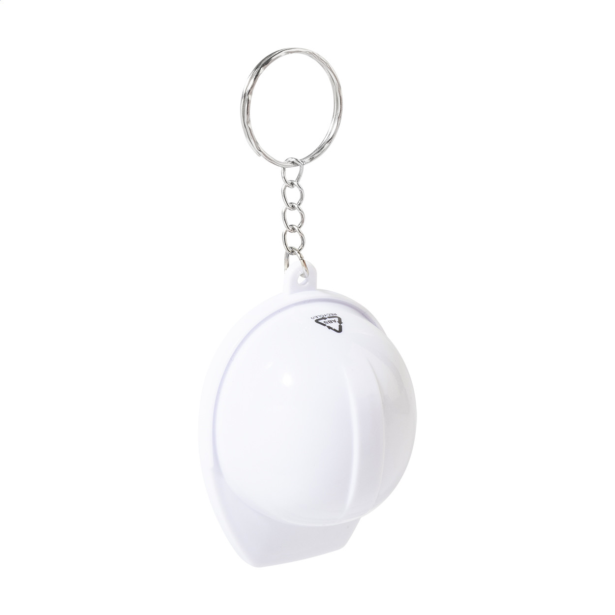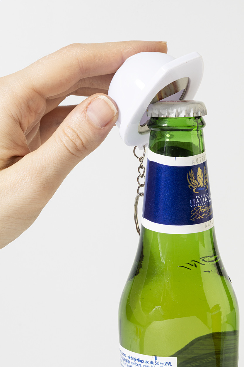 Újrahasznosított ABS műanyagból készült, sisak alakú kulcstartó üvegnyitóval.