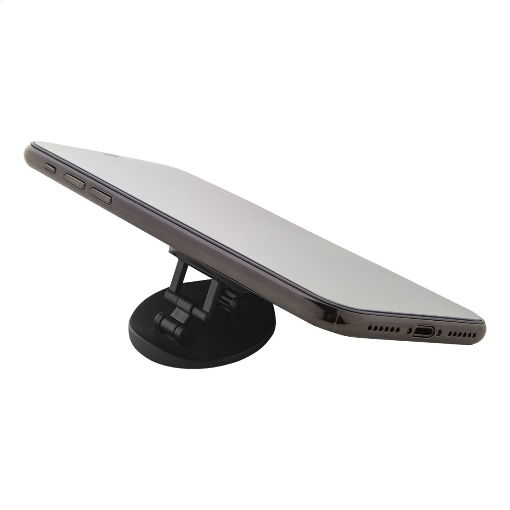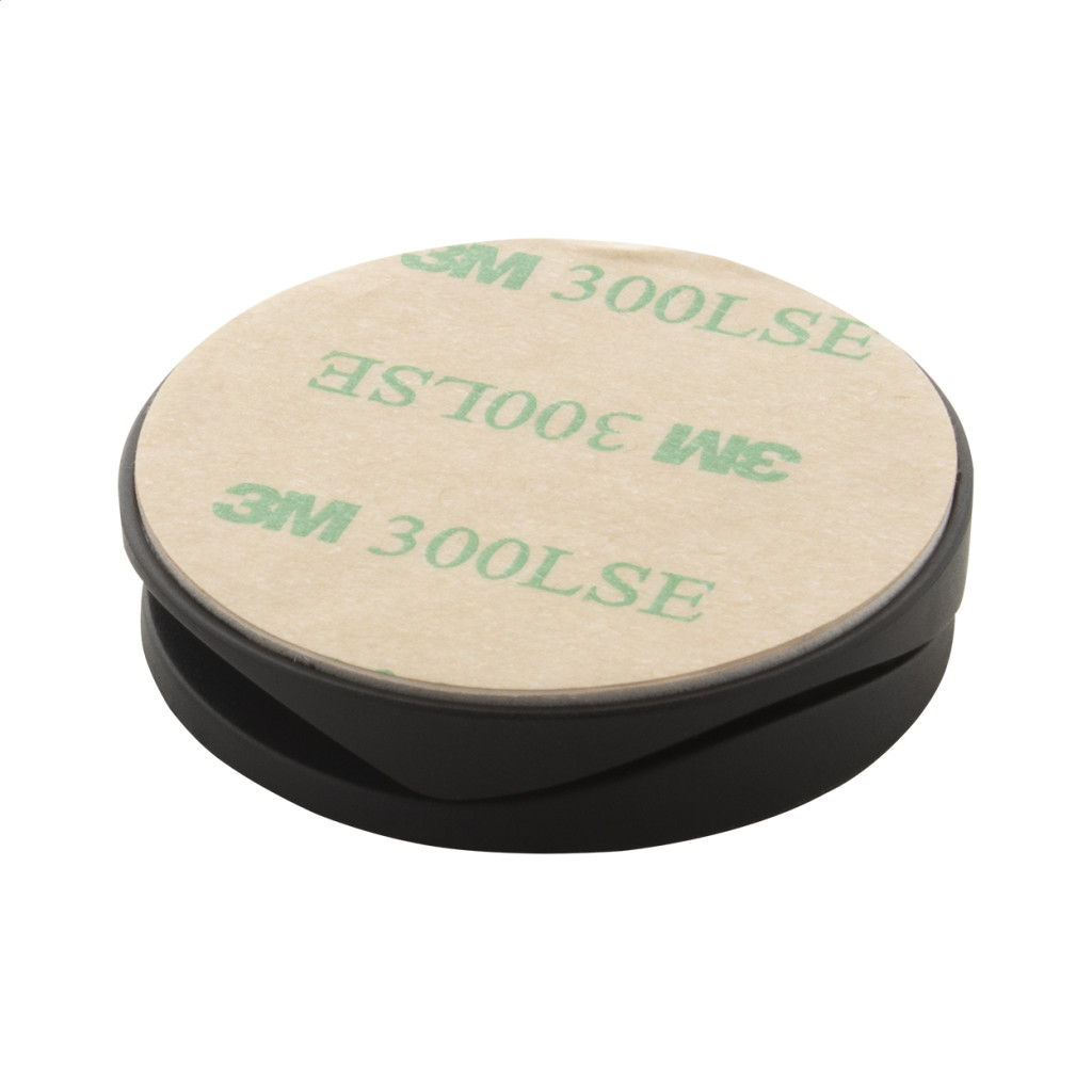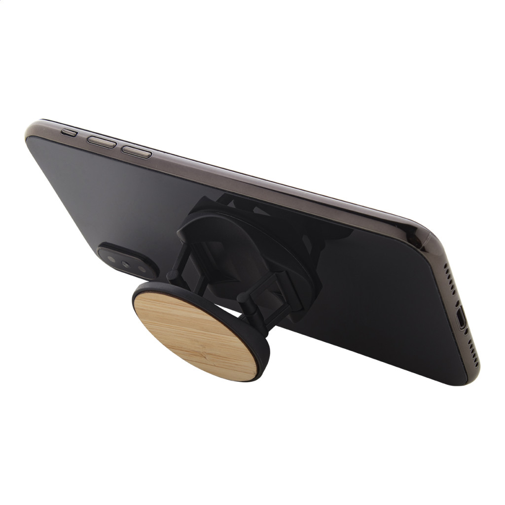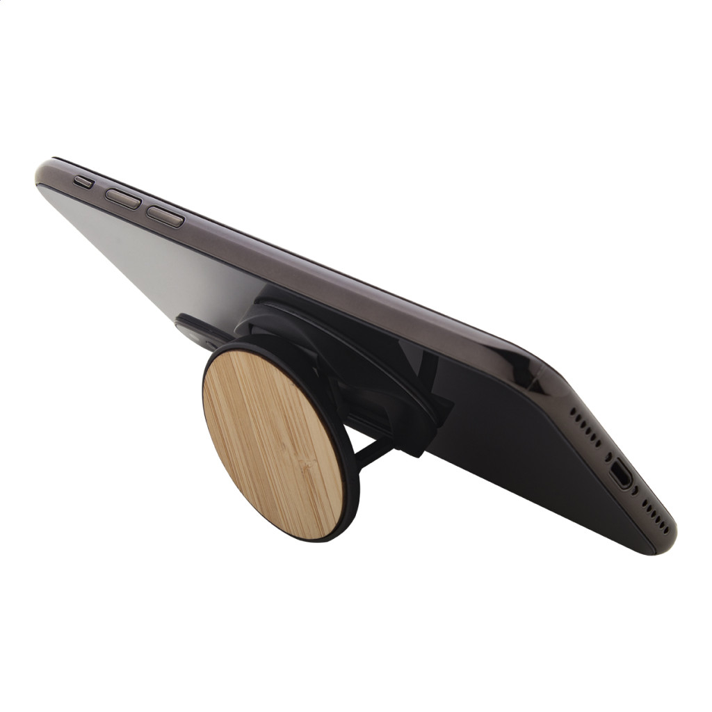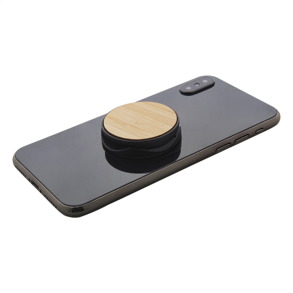 Bambusz borítású, kerek műanyag mobiltartó öntapadós rögzítéssel.