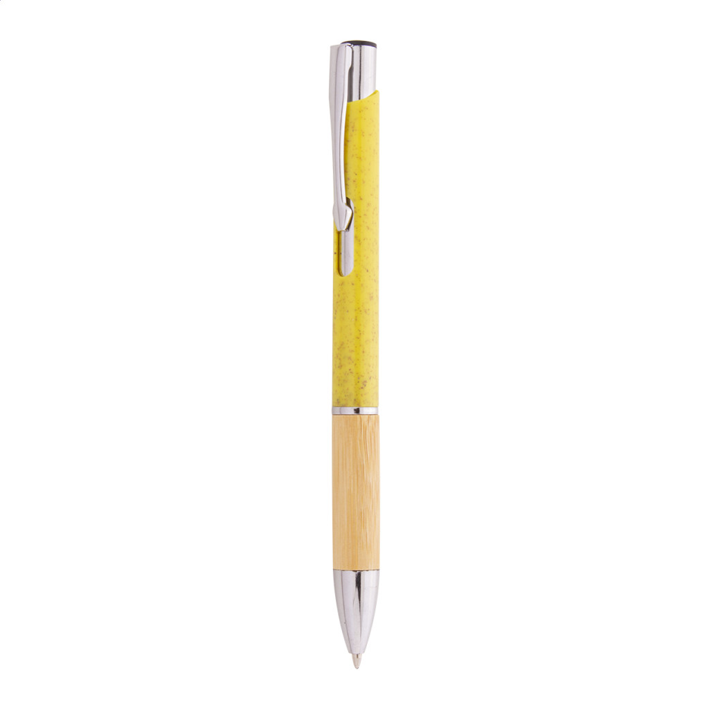 Környezetbarát búzaszalma műanyag golyóstoll bambusz markolattal és fém részekkel. Kék tollbetéttel szállítjuk.