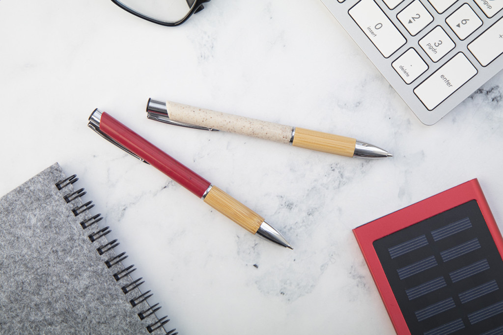 Környezetbarát búzaszalma műanyag golyóstoll bambusz markolattal és fém részekkel. Kék tollbetéttel szállítjuk.