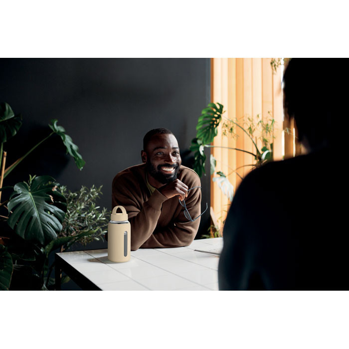 Boroszilikát üveg palack szilikon tokkal és fogantyús PP fedéllel. Űrtartalom: 600 ml.
