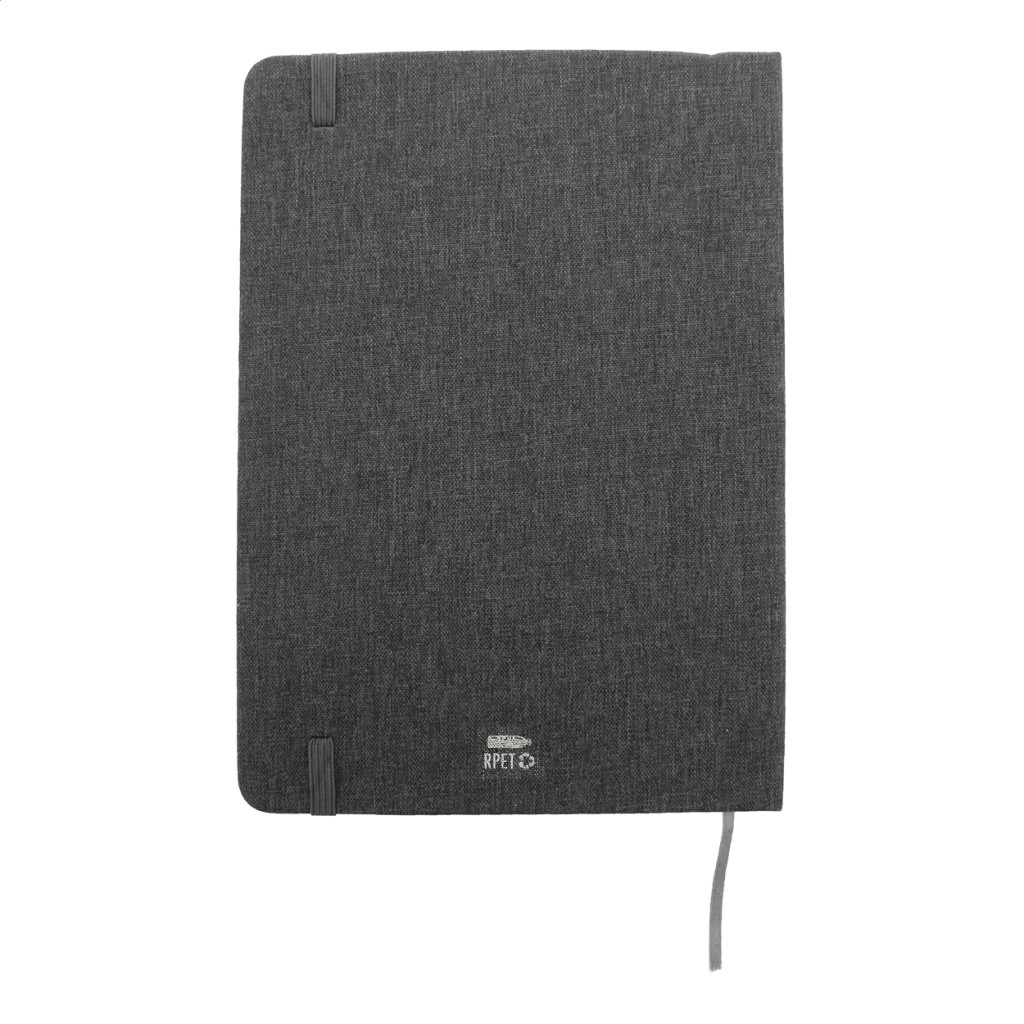 RPET poliészter borítású spirál jegyzetfüzet bambusz betéttel és telefon-tartó funkcióval. 80 újrahasznosított papírból készült vonalas lappal, gumis pánttal és könyvjelzővel. A5 méretű.