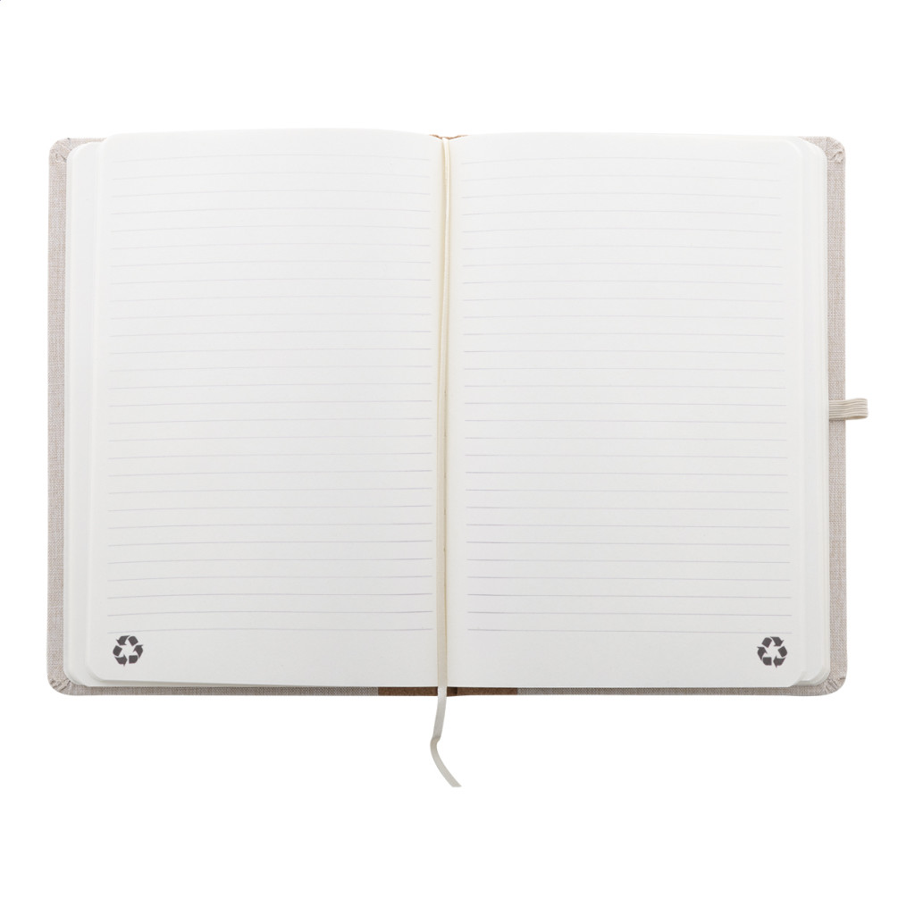 RPET poliészter borítású jegyzetfüzet natúr parafa gerinccel és 80 vonalas lappal, újrahasznosított papírból. Könyvjelzővel, gumipánttal és tolltartóval. A5 méretű.