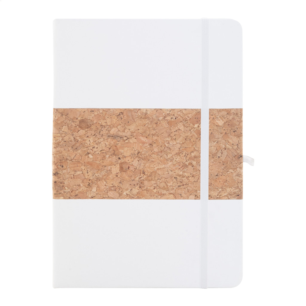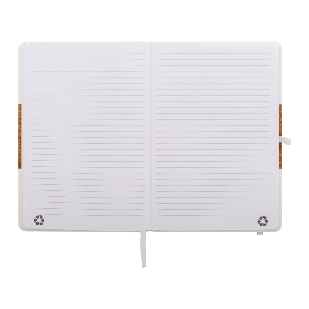 Természetes parafa és újrahasznosított PU bőr borítású jegyzetfüzet hozzáillő színű könyvjelzővel, gumiszalaggal és tolltartóval. 80 vonalas lappal, újrahasznosított papírból. A5 méretű.