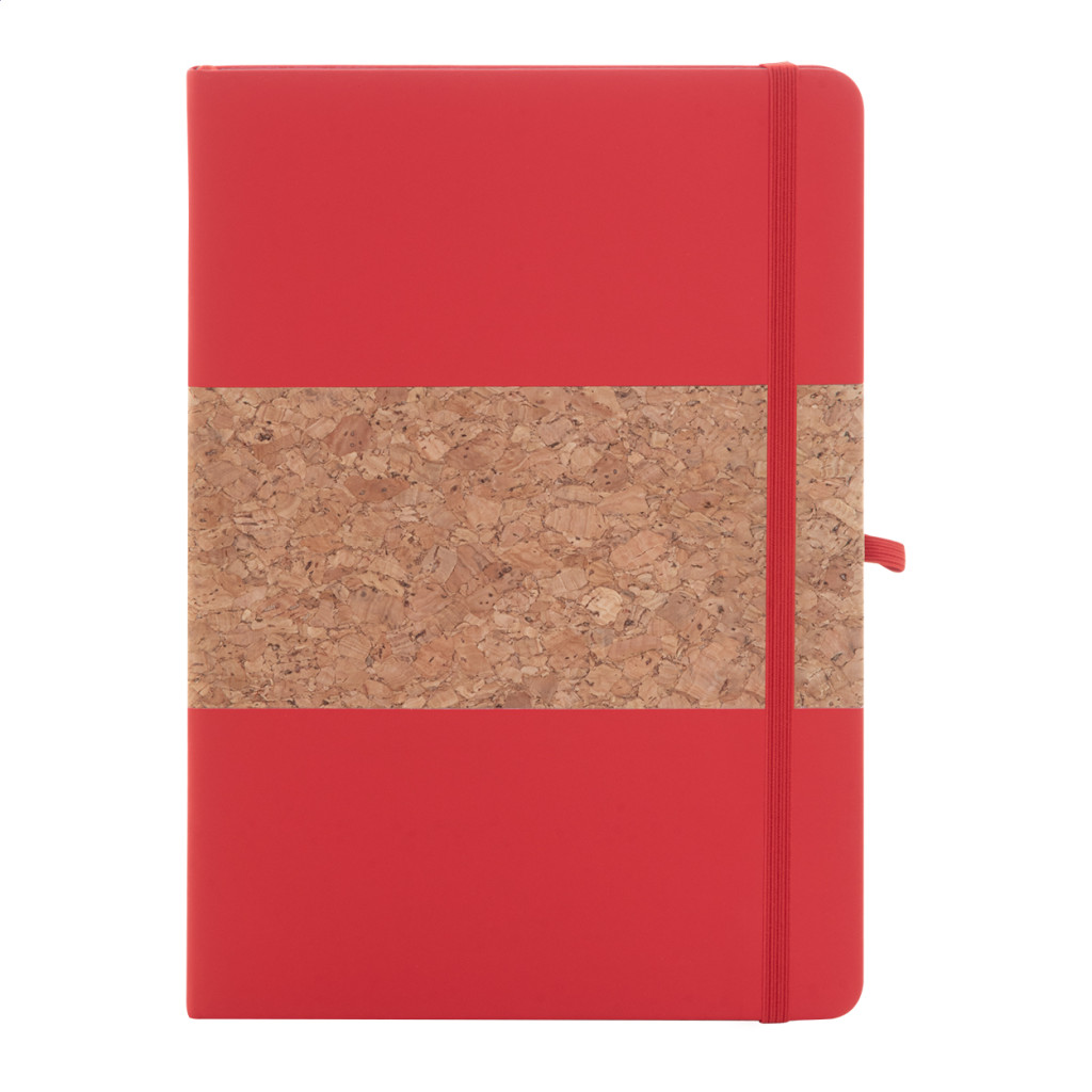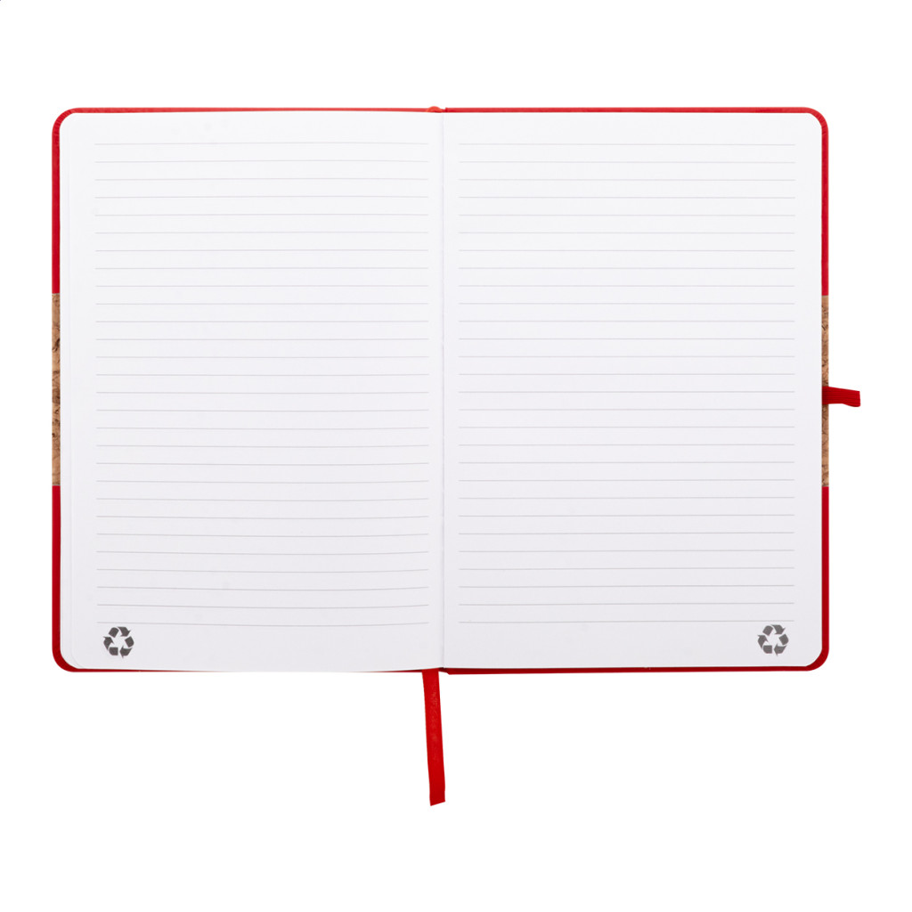 Természetes parafa és újrahasznosított PU bőr borítású jegyzetfüzet hozzáillő színű könyvjelzővel, gumiszalaggal és tolltartóval. 80 vonalas lappal, újrahasznosított papírból. A5 méretű.