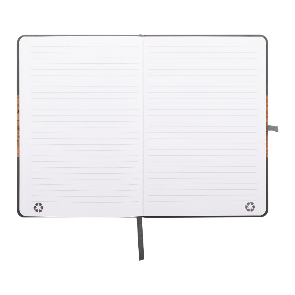 Természetes parafa és újrahasznosított PU bőr borítású jegyzetfüzet hozzáillő színű könyvjelzővel, gumiszalaggal és tolltartóval. 80 vonalas lappal, újrahasznosított papírból. A5 méretű.
