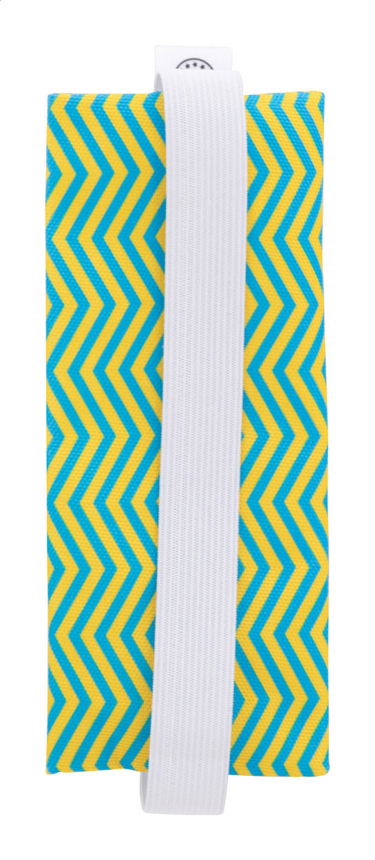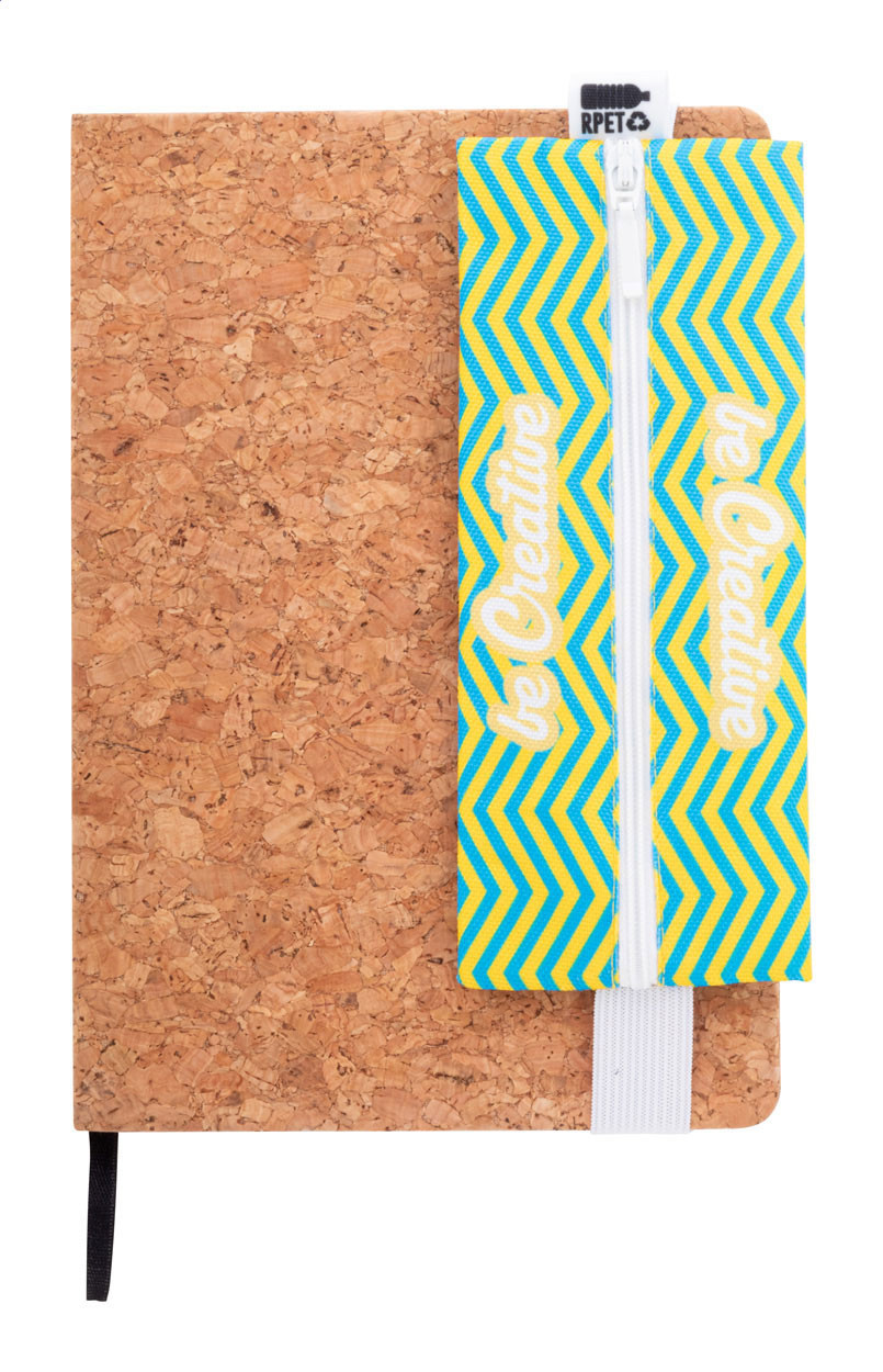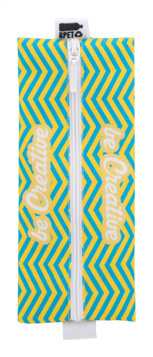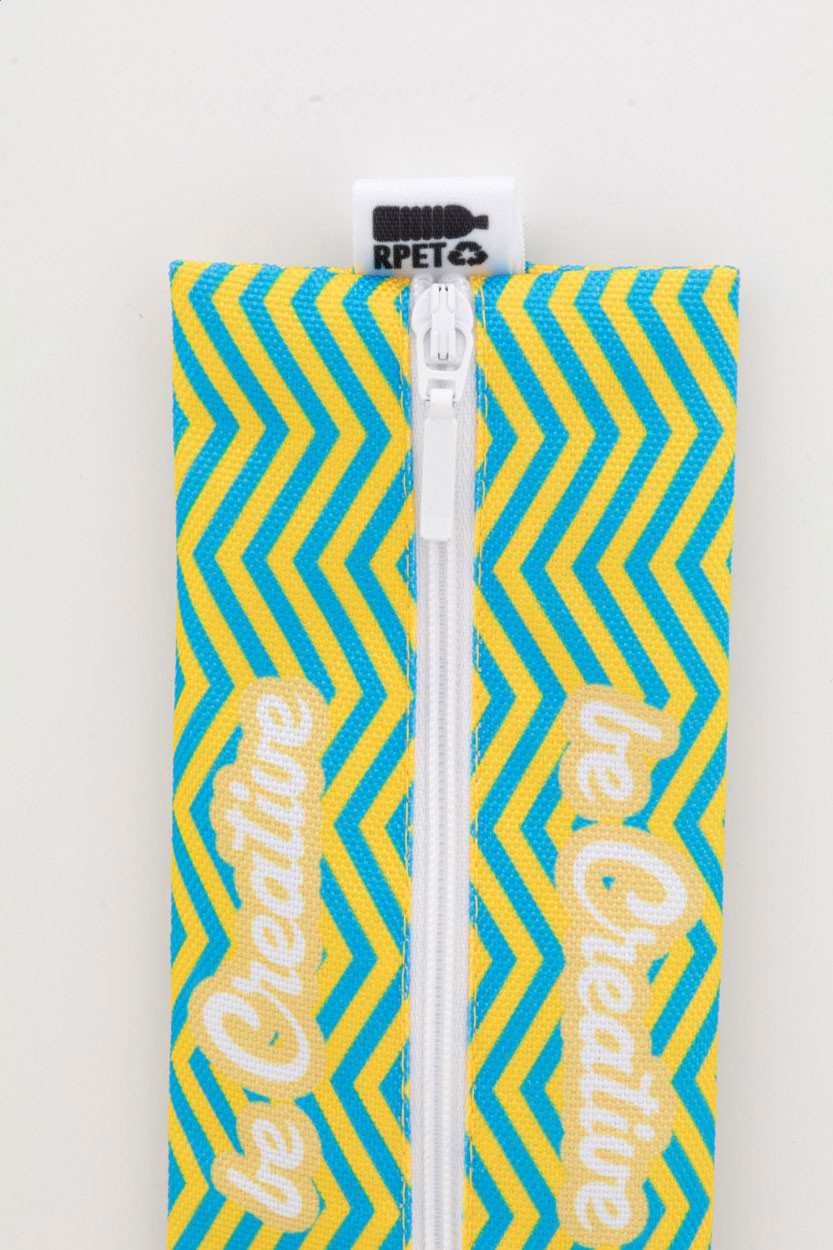 Egyedi gyártású, cipzáras tolltartó 600D RPET poliészterből, gumiszalaggal a jegyzetfüzet borítóra való rögzítéshez. Teljes felületén szublimációs nyomtatással ellátva és megkülönböztető RPET címkével. Minimális rendelési mennyiség: 50 db.