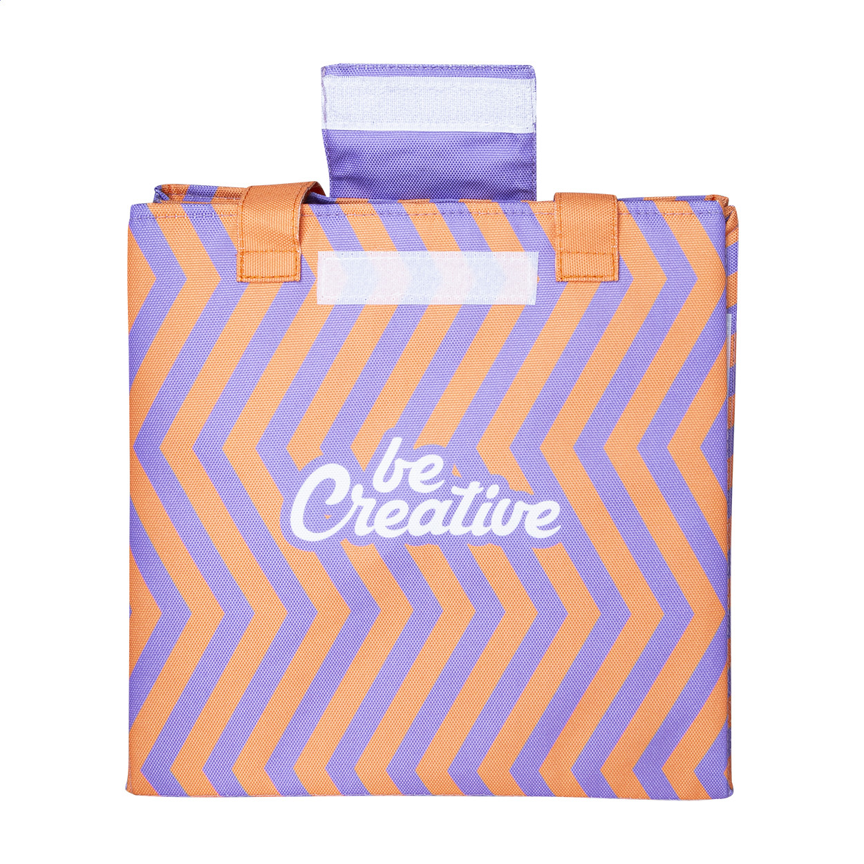 Egyedi gyártású, 600D RPET poliészter hűtőtáska alumínium béléssel, tépőzárral és hosszú fogantyúval. Kosárként és pikniktakaróként is használható. Teljes felületén szublimációs nyomtatott grafikával és megkülönböztető RPET címkével. Minimális rendelési mennyiség: 25 db.