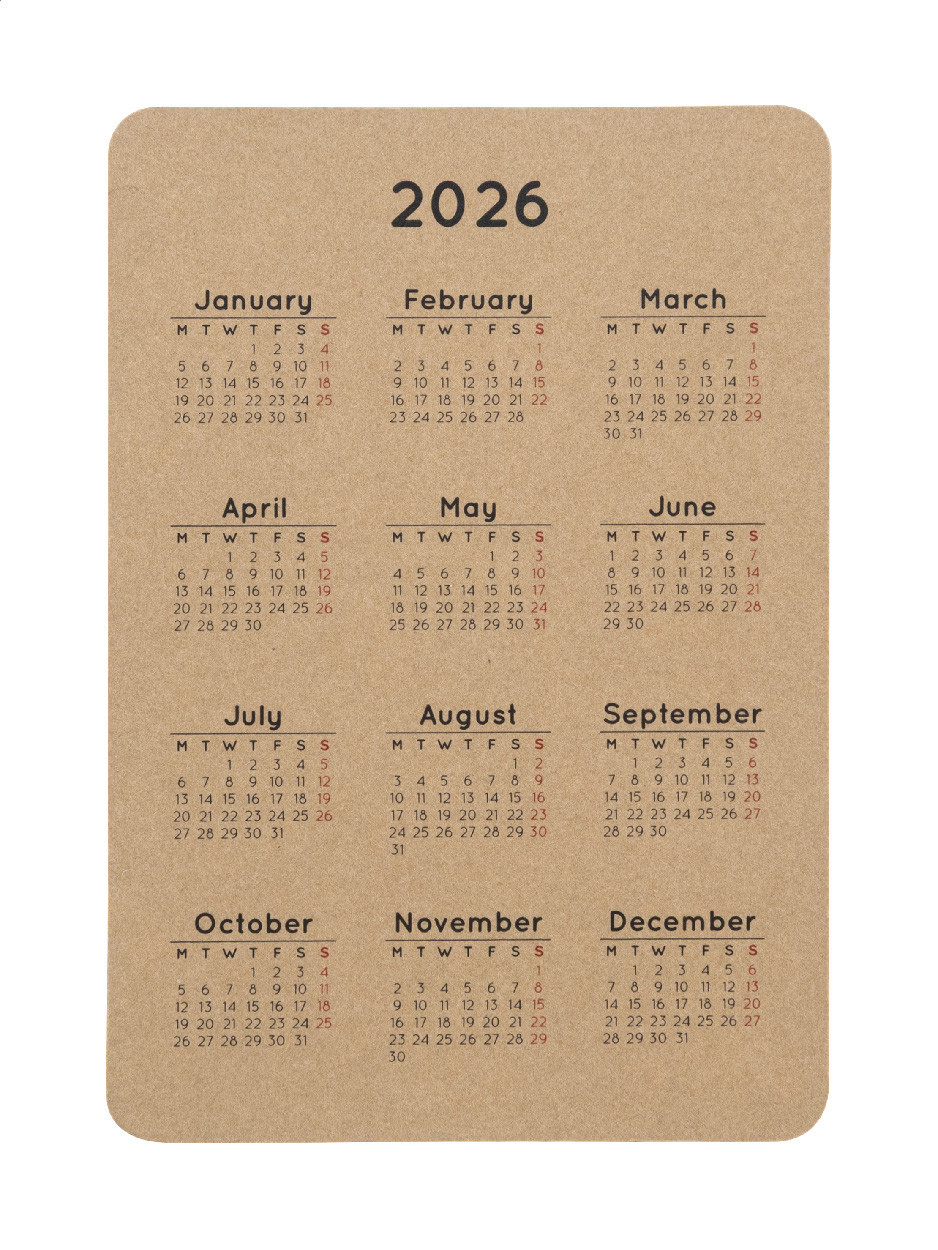 Egyedi gyártású, kisméretű kraft papírkártya-naptár (300 g/m²) full-colour grafikákkal. Az ár tartalmazza a digitális nyomtatást mindkét oldalra. Minimális rendelési mennyiség: 250 db.