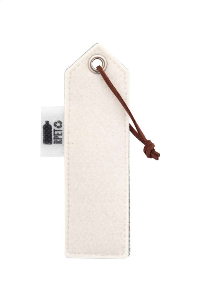 Egyediesíthető, RPET filcből készült könyvjelző, full colour emblémázható előlappal és PU bőr zsinórral. Megkülönböztető RPET címkével. Az ár tartalmazza a szublimációs emblémázást. Minimális rendelési mennyiség: 100 db.
