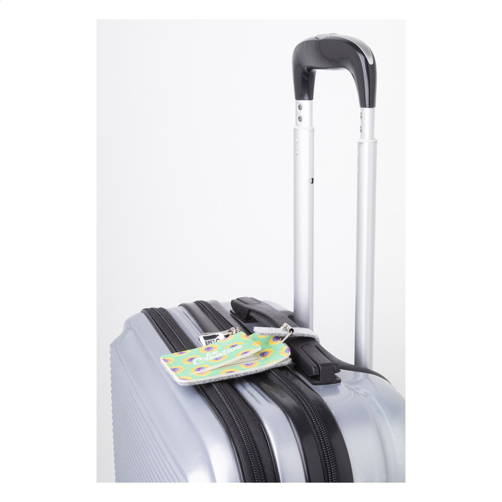 Egyedi gyártású, RPET filc bőröndcímke full-colour emblémázható előlappal, csatos zárással és papírbetéttel. Megkülönböztető RPET címkével. Az ár tartalmazza a szublimációs emblémázást. Minimális rendelési mennyiség: 50 db.
