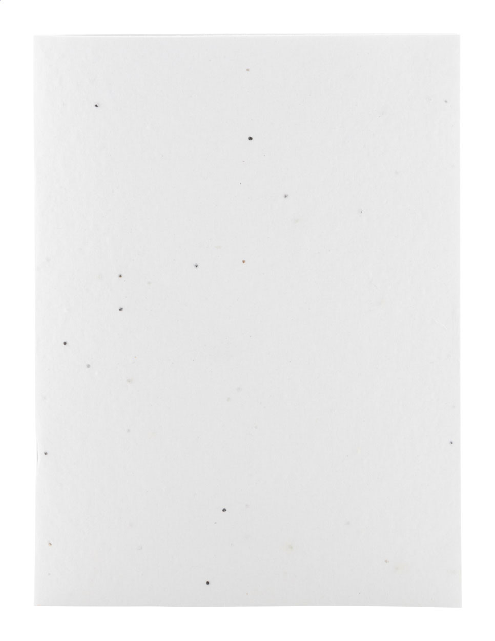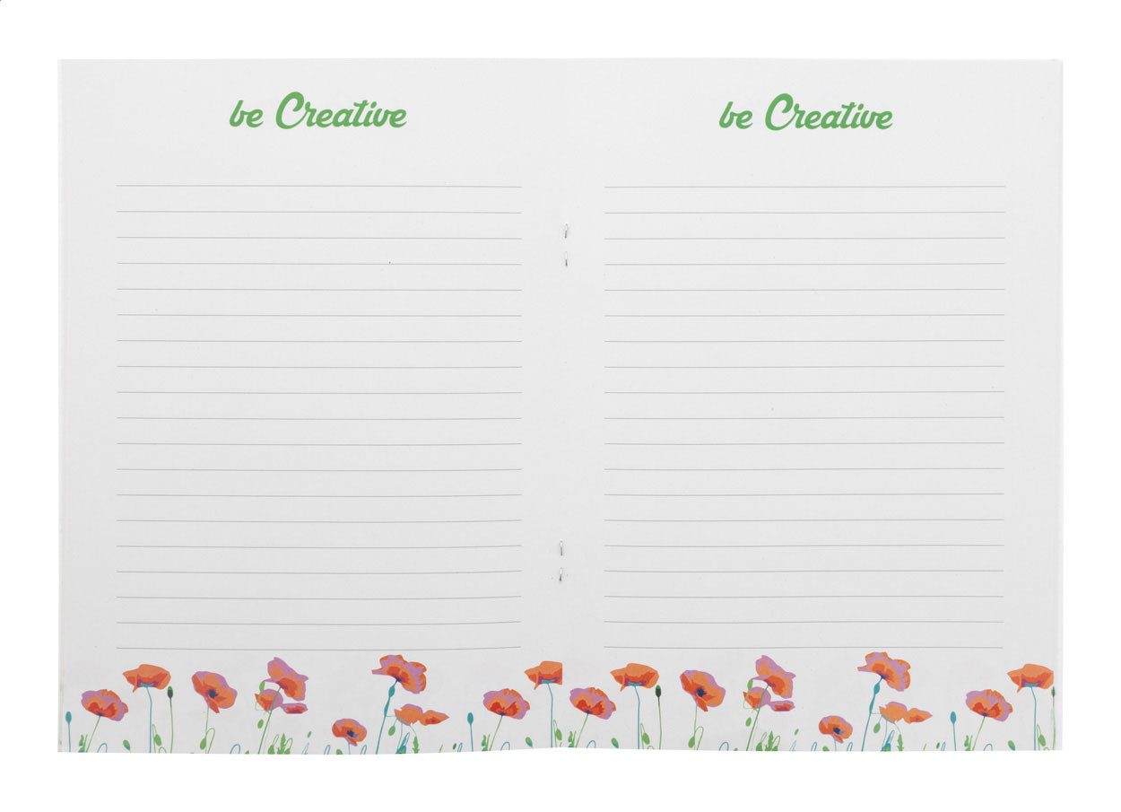 Egyedi gyártású, magpapírral borított jegyzetfüzet 32 újrahasznosított papírlappal, A5 méretű. Az ár tartalmazza a full-colour nyomtatott külső borítót és a belső oldalak azonos full-colour nyomtatását. Minimális rendelési mennyiség: 100 db. Válogatott vadvirág magvakkal.