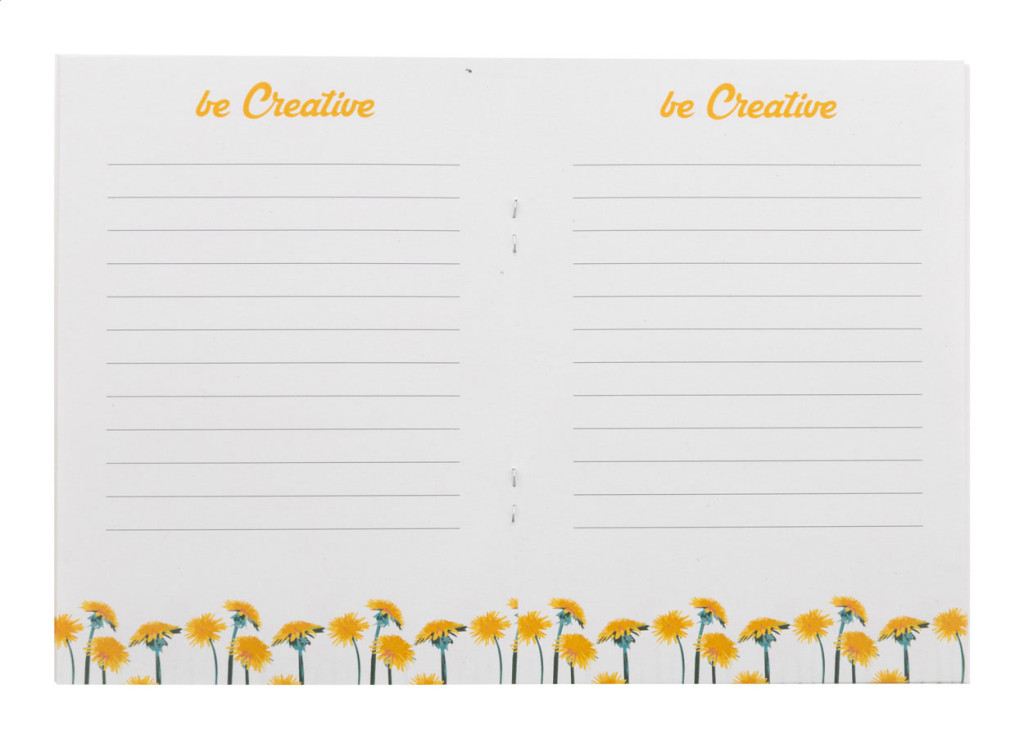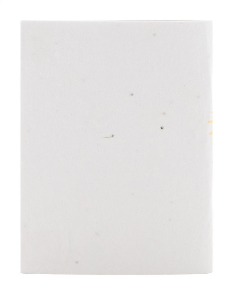 Egyedi gyártású, magpapírral borított jegyzetfüzet 32 újrahasznosított papírlappal, A6 méretű. Az ár tartalmazza a full-colour nyomtatott külső borítót és a belső oldalak azonos full-colour nyomtatását. Minimális rendelési mennyiség: 100 db. Válogatott vadvirág magvakkal.