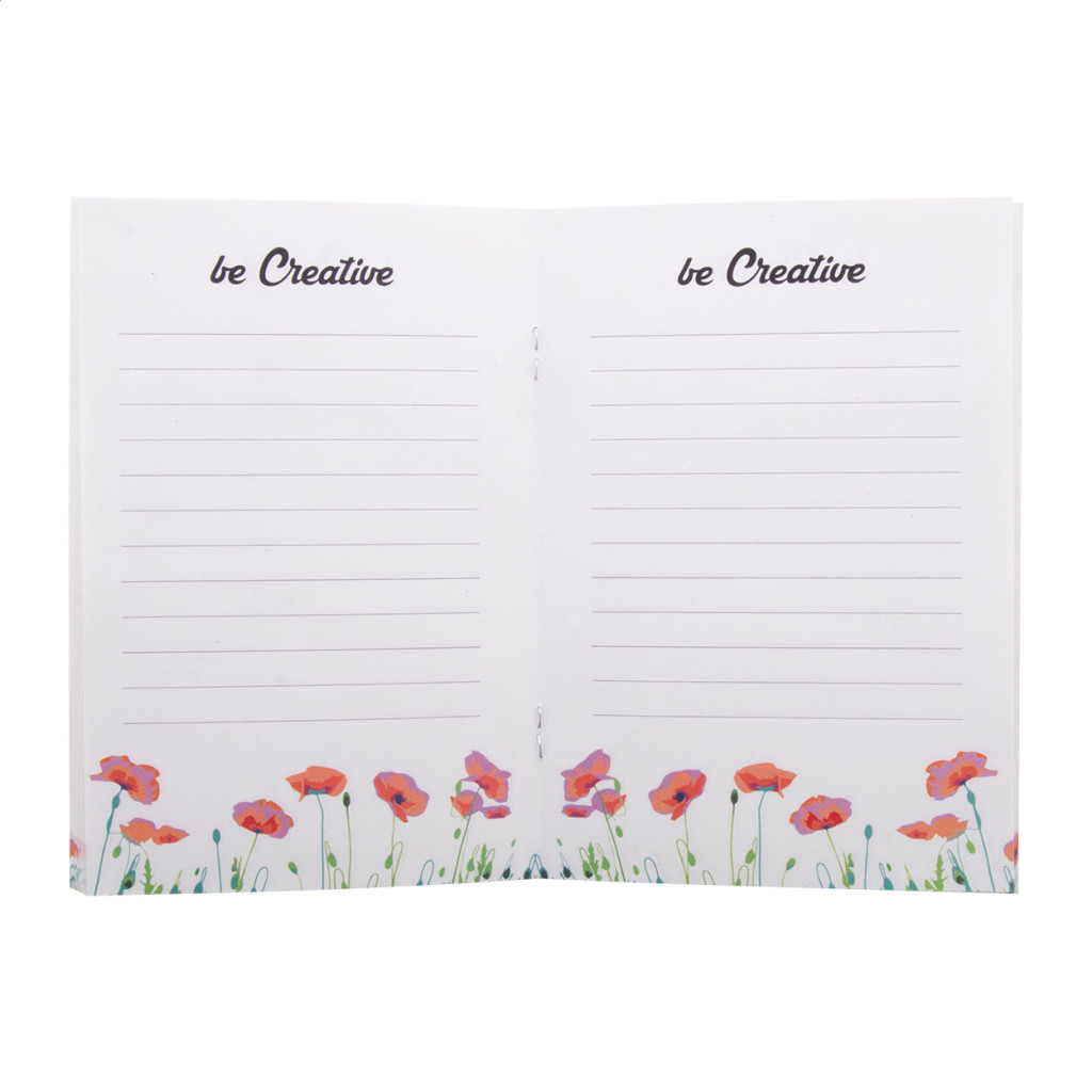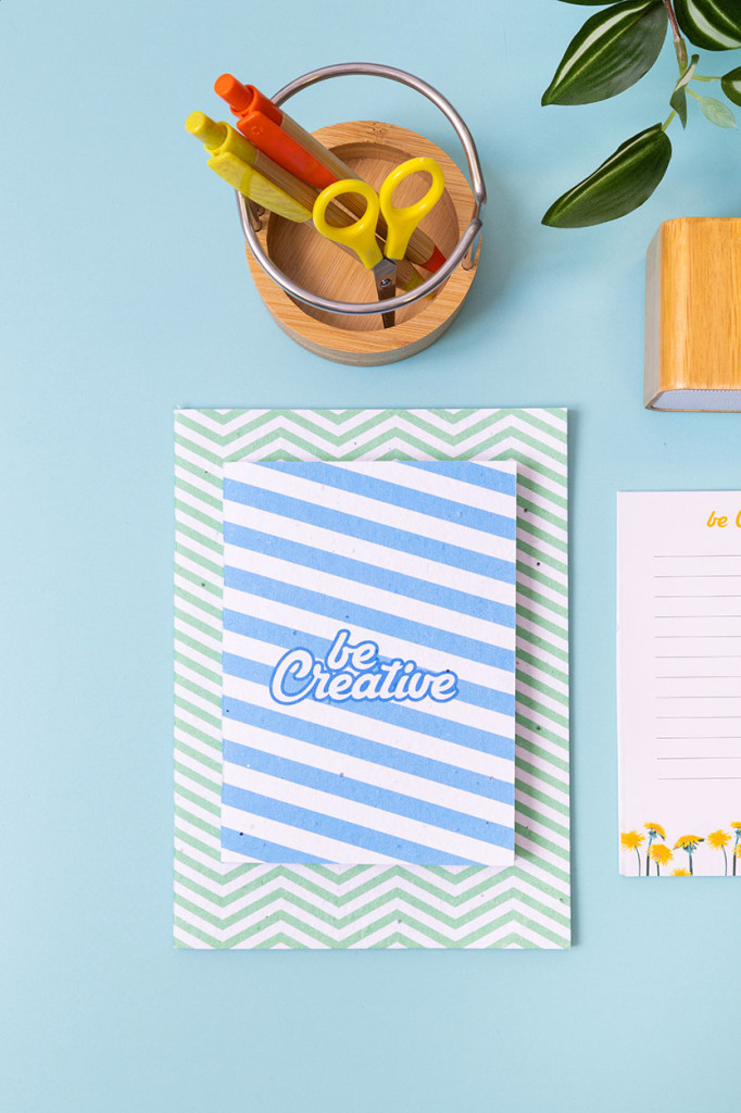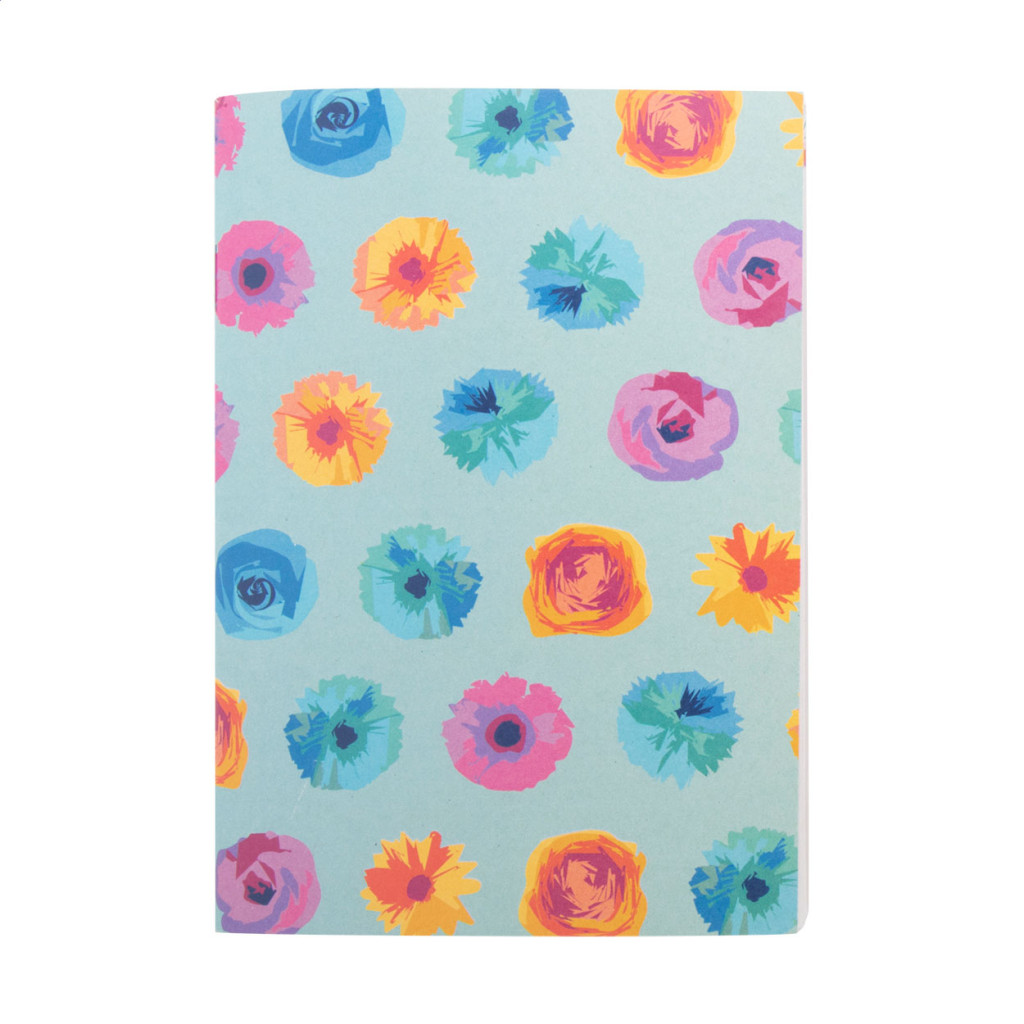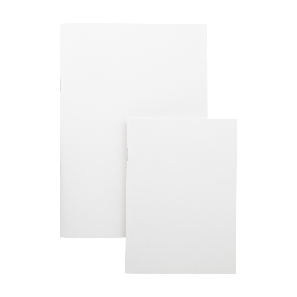 Egyediesíthető, A6 méretű jegyzetfüzett újrahasznosított papír borítóval, 32 újrahasznosított papírlappal. Az ár tartalmazza a borító full colour emblémázását és egy további mintát minden belső oldalon. Minimális rendelési mennyiség: 100 db.