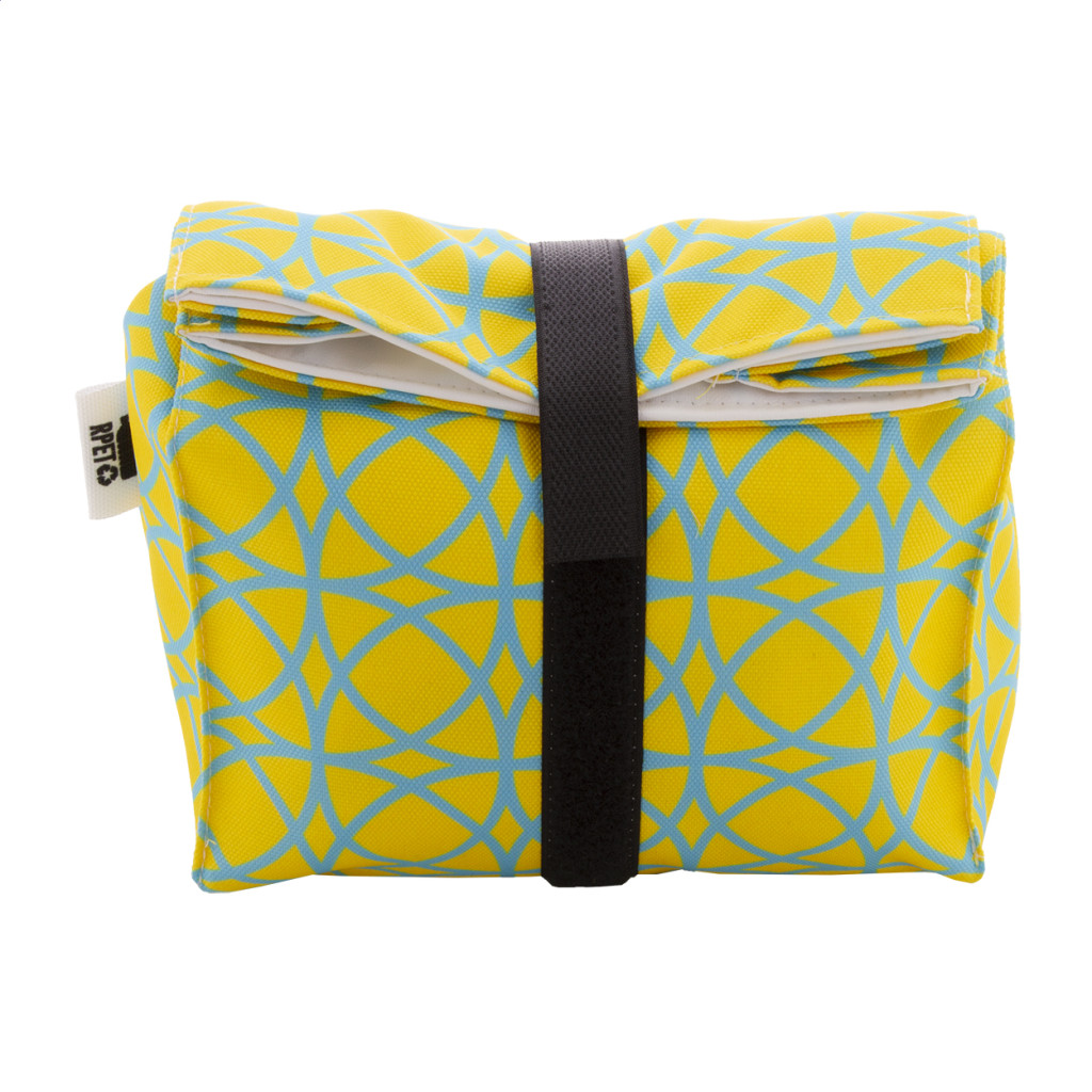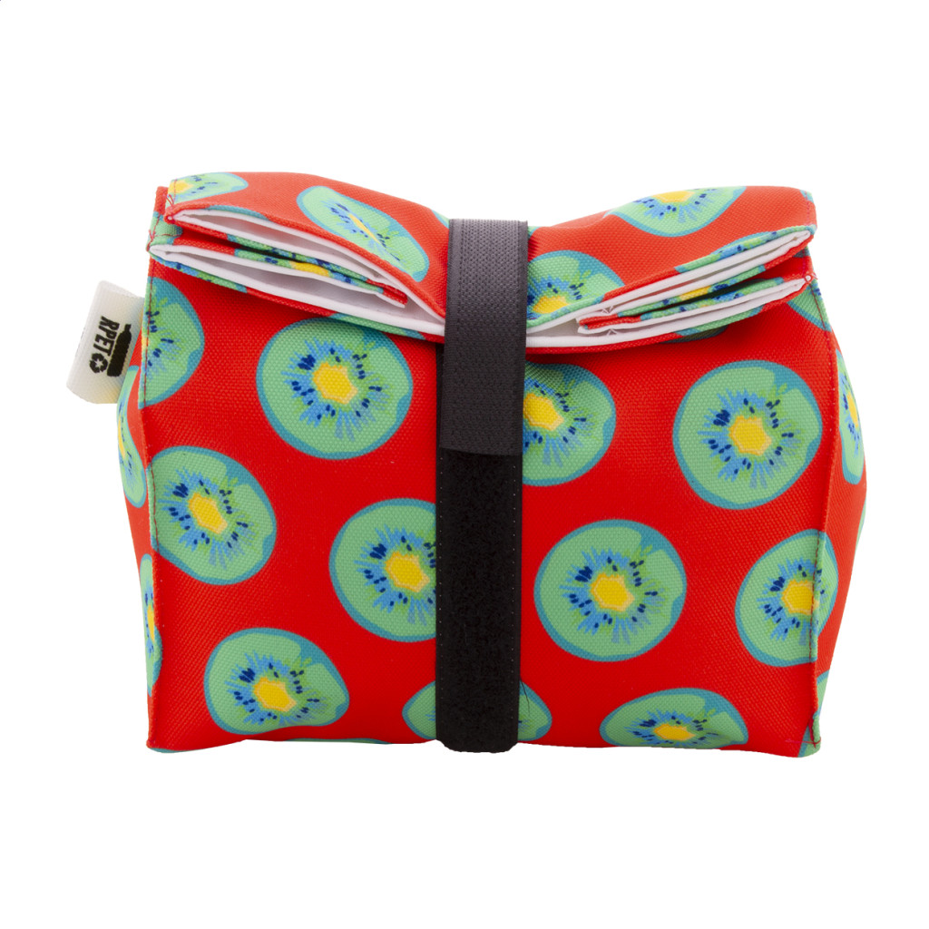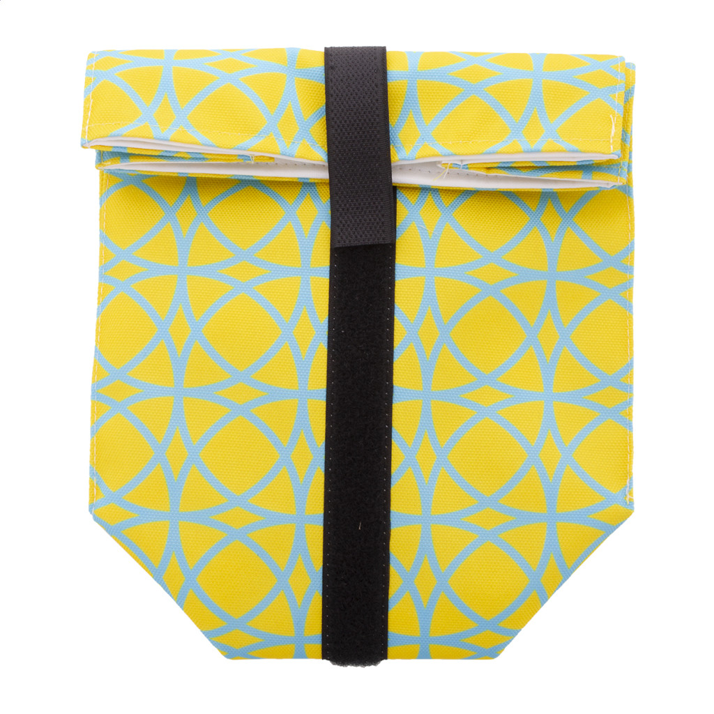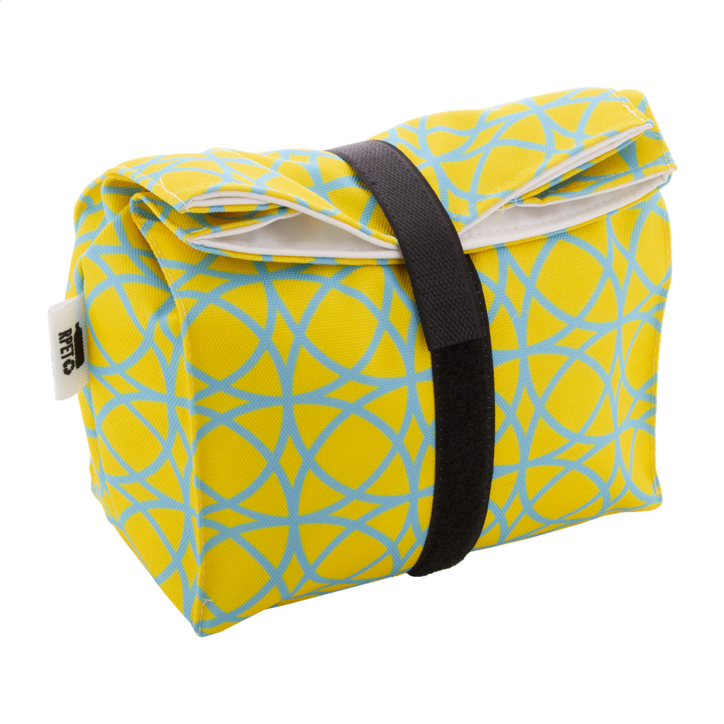Egyediesíthető, újrafelhasználható 600D RPET poliészterből készült rolltop uzsonnás tasak, tartós vízálló béléssel és tépőzárral. Ideális rágcsálnivalók vagy szendvicsek csomagolására. Az ár tartalmazza a szublimációs eljárás költségét a termék teljes felületén. Minimális rendelési mennyiség: 25 db.
