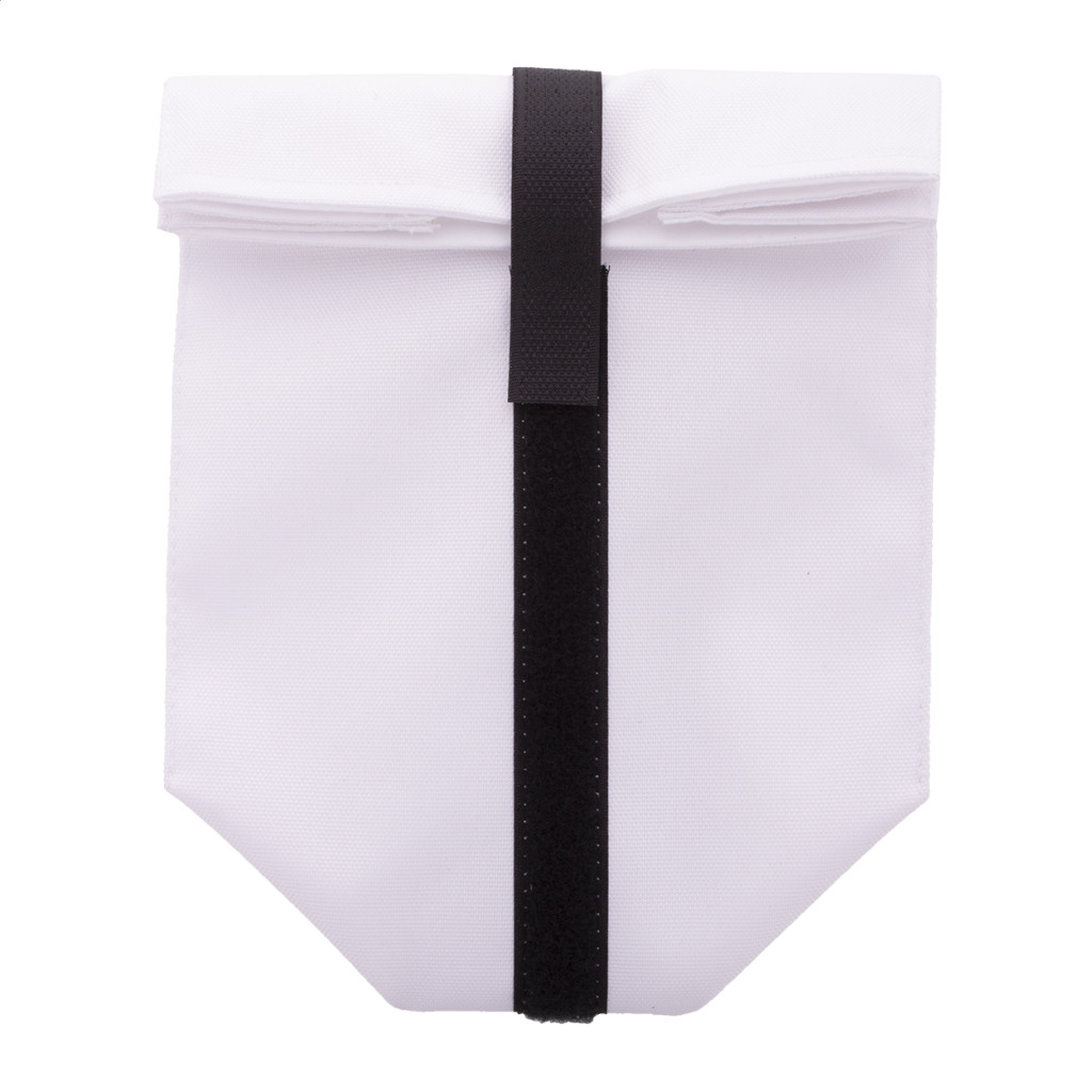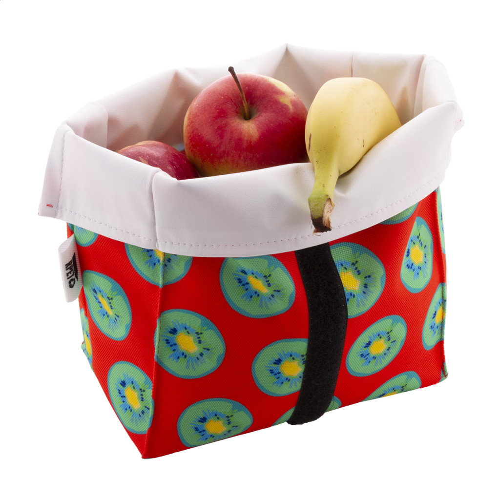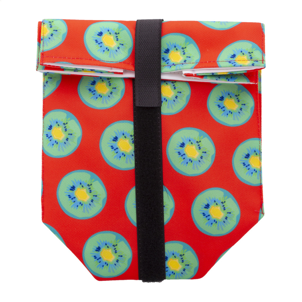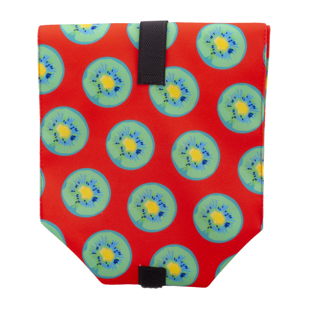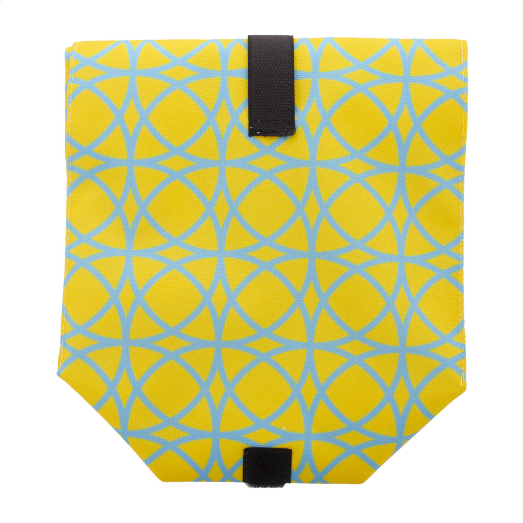 Egyediesíthető, újrafelhasználható 600D RPET poliészterből készült rolltop uzsonnás tasak, tartós vízálló béléssel és tépőzárral. Ideális rágcsálnivalók vagy szendvicsek csomagolására. Az ár tartalmazza a szublimációs eljárás költségét a termék teljes felületén. Minimális rendelési mennyiség: 25 db.