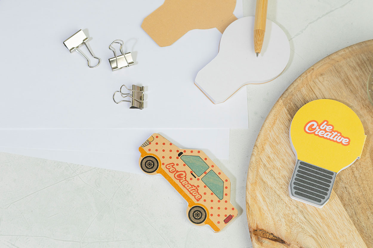 Egyedi gyártású, villanykörte alakú öntapadós jegyzettömb papír borítással. 50 újrahasznosított papírból készült öntapadós jegyzetlapot tartalmaz. Az ár tartalmazza a full-colour nyomtatott külső borítót. Minimális rendelési mennyiség: 100 db.