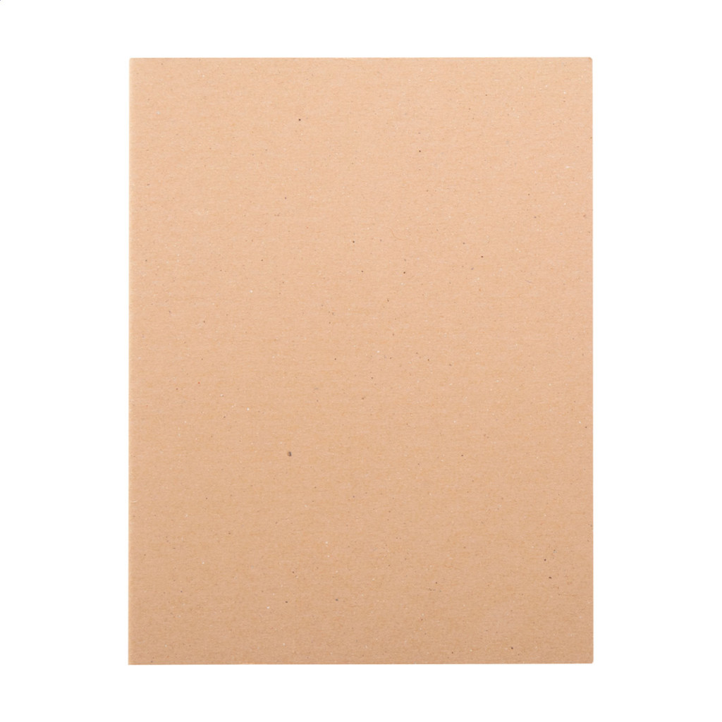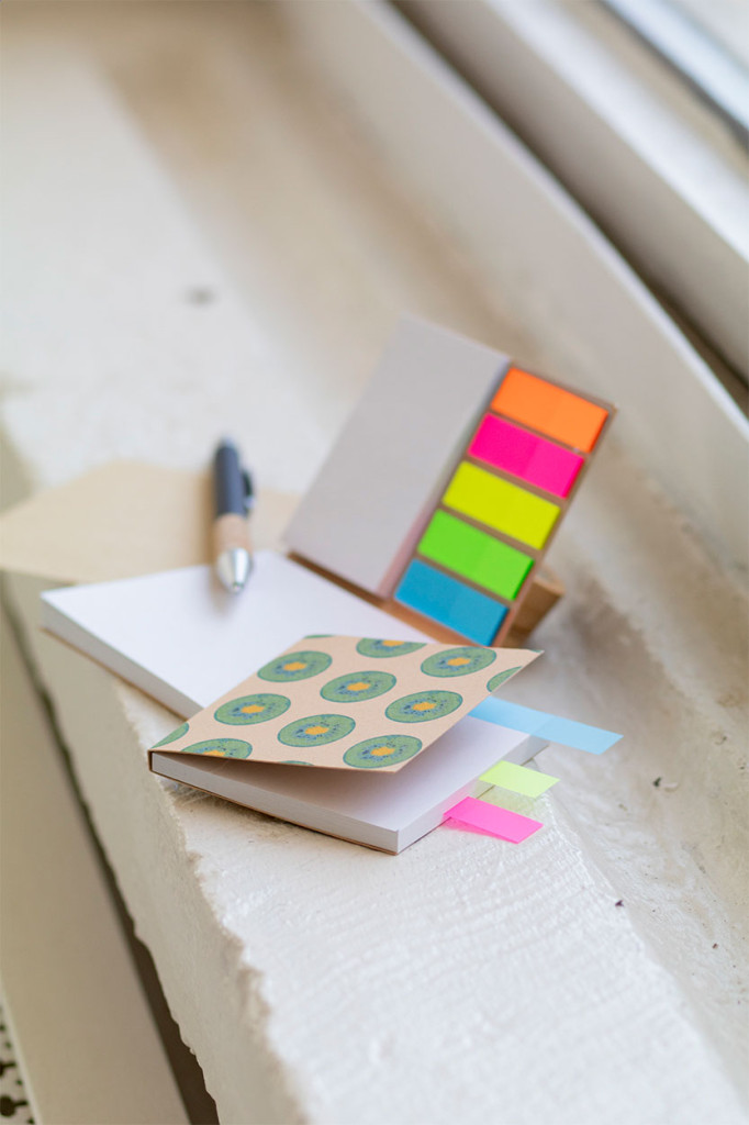 Egyediesíthető, újrahasznosított kraft papírral borított öntapadós jegyzettömb. Tartalmaz újrahasznosított papír öntapadós jegyzetlapokat 2 méretben (50 lap 100×75 mm és 25 lap 50×75 mm) és 100 műanyag fólia oldaljelölőt 5 különböző színben (44×12 mm). Az ár tartalmazza a külső borító full-colour nyomtatását. Minimális rendelési mennyiség: 100 db.