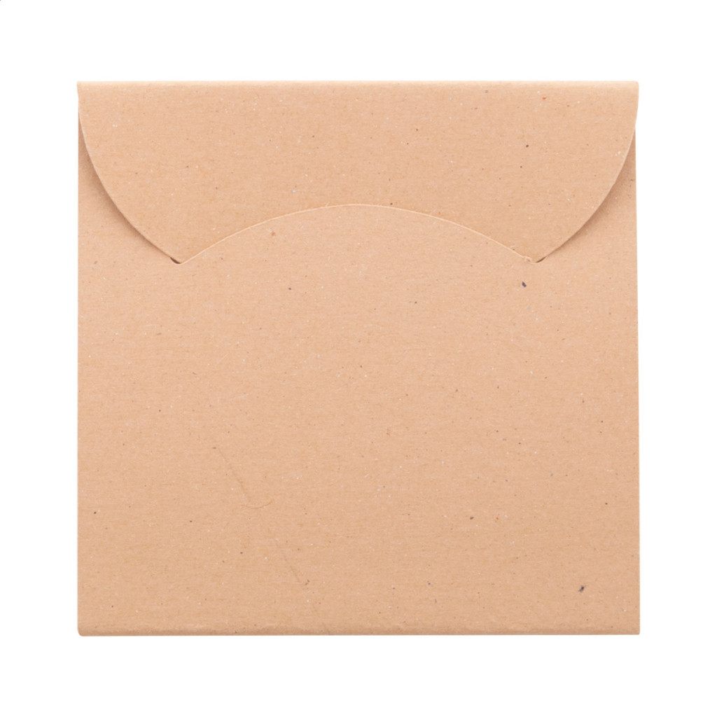 Egyediesíthető, újrahasznosított kraft papírral borított öntapadós jegyzettömb. Tartalmaz 50 újrahasznosított papír öntapadós jegyzetlapot (75×75 mm) és 100 műanyag fólia oldaljelölőt 5 különböző színben (44×12 mm). Az ár tartalmazza a külső borító full-colour nyomtatását. Minimális rendelési mennyiség: 100 db.
