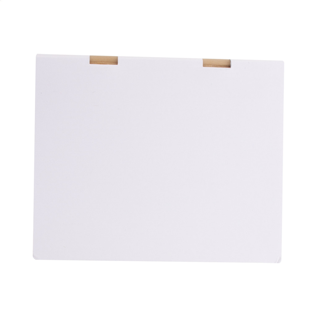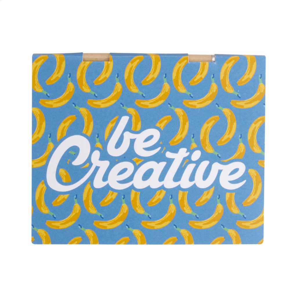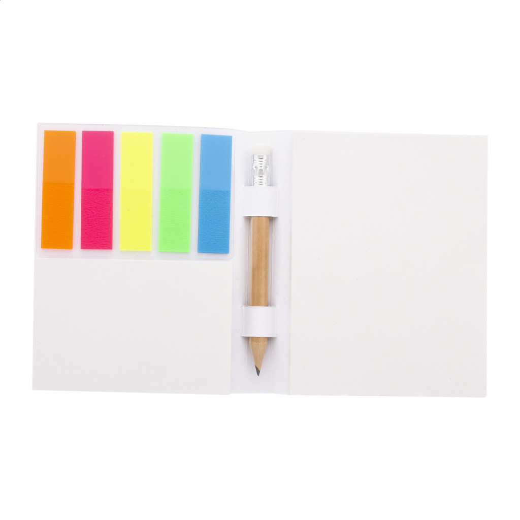 Egyediesíthető, papírral borított öntapadós jegyzettömb mini fa ceruzával. Újrahasznosított papírból készült öntapadós lapokkal 2 méretben (50 db 100×75 mm-es, 25 db 50×75 mm-es lap) és 100 műanyag oldaljelölővel 5 különböző színben (12×44 mm). Az ár tartalmazza a full colour nyomtatást a külső borítón. Minimális rendelési mennyiség: 100 db.