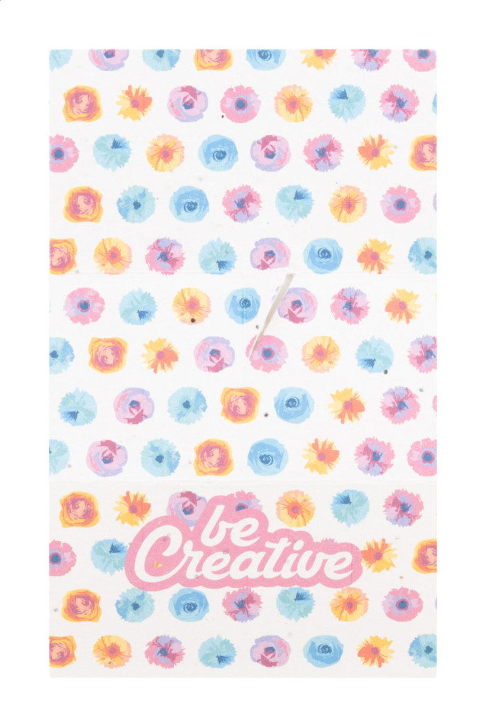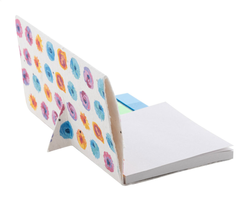 Egyedi gyártású magpapír jegyzetadagoló függőleges fejléccel. 50 újrahasznosított papírból készült cetlit (75×75 mm) és 100 műanyag oldaljelölőt tartalmaz, 5 különböző színben (44×12 mm). Az ár tartalmazza a teljes színes nyomtatást a fejlécre. Minimális rendelési mennyiség: 100 db. Válogatott vadvirágmagokkal.