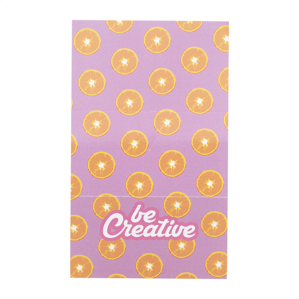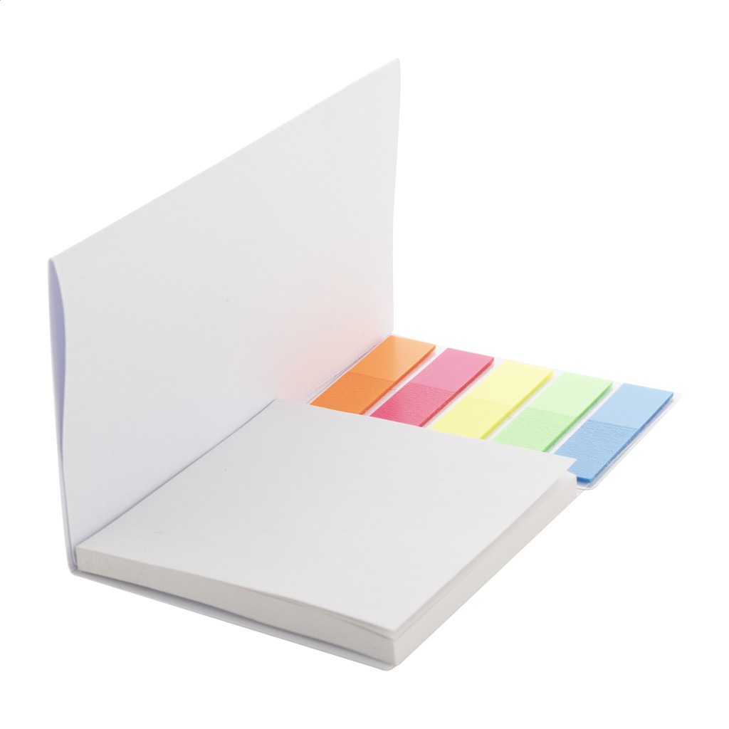 Egyedi gyártású papír jegyzetadagoló függőleges fejléccel. 50 újrahasznosított papírból készült cetlit (75×75 mm) és 100 műanyag oldaljelölőt tartalmaz, 5 különböző színben (44×12 mm). Az ár tartalmazza a teljes színes nyomtatást a fejlécre. Minimális rendelési mennyiség: 100 db.
