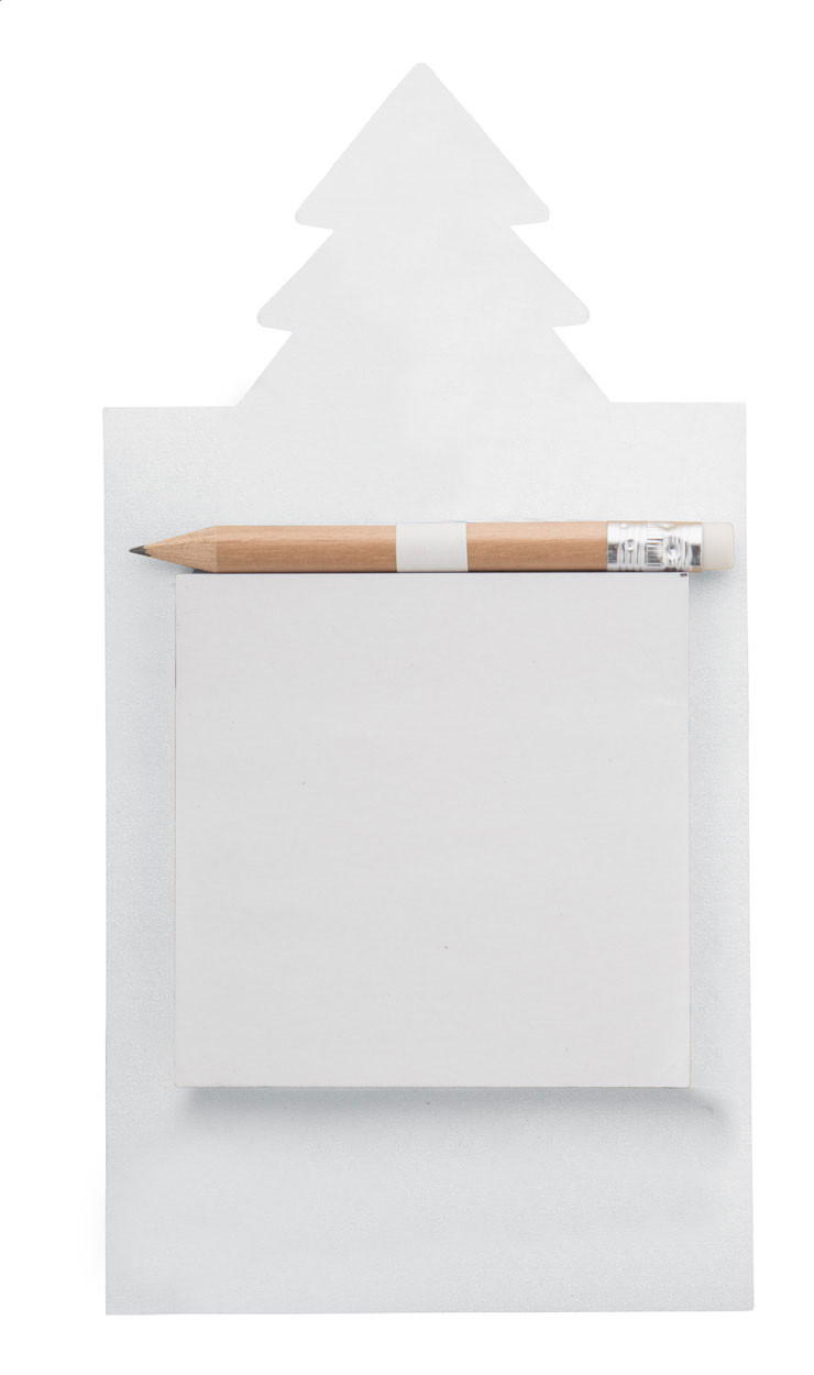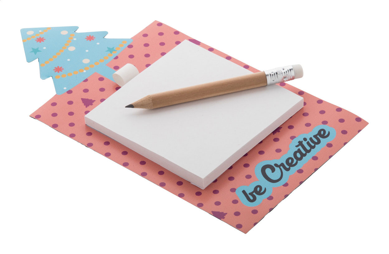 Egyediesíthető, full-colour emblémázott hűtőmágnes karácsonyfadíszítéssel, öntapadós jegyzettömbbel és mini fa ceruzával. Tartalmaz egy 50 lapos, újrahasznosított papírból készült öntapadós jegyzetfüzetet (75×75 mm). Minimális rendelési mennyiség 100 db.