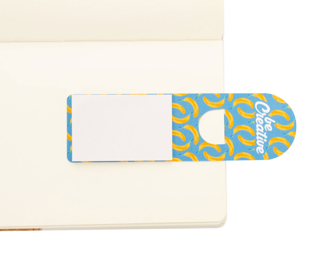 Egyediesíthető papír könyvjelző öntapadó lapokkal. 25 db újrahasznosított papírból készült öntapadó lapot tartalmaz (50×75 mm). Az ár tartalmazza a full colour nyomtatást a termék elülső oldalán. Minimális rendelési mennyiség: 100 db.