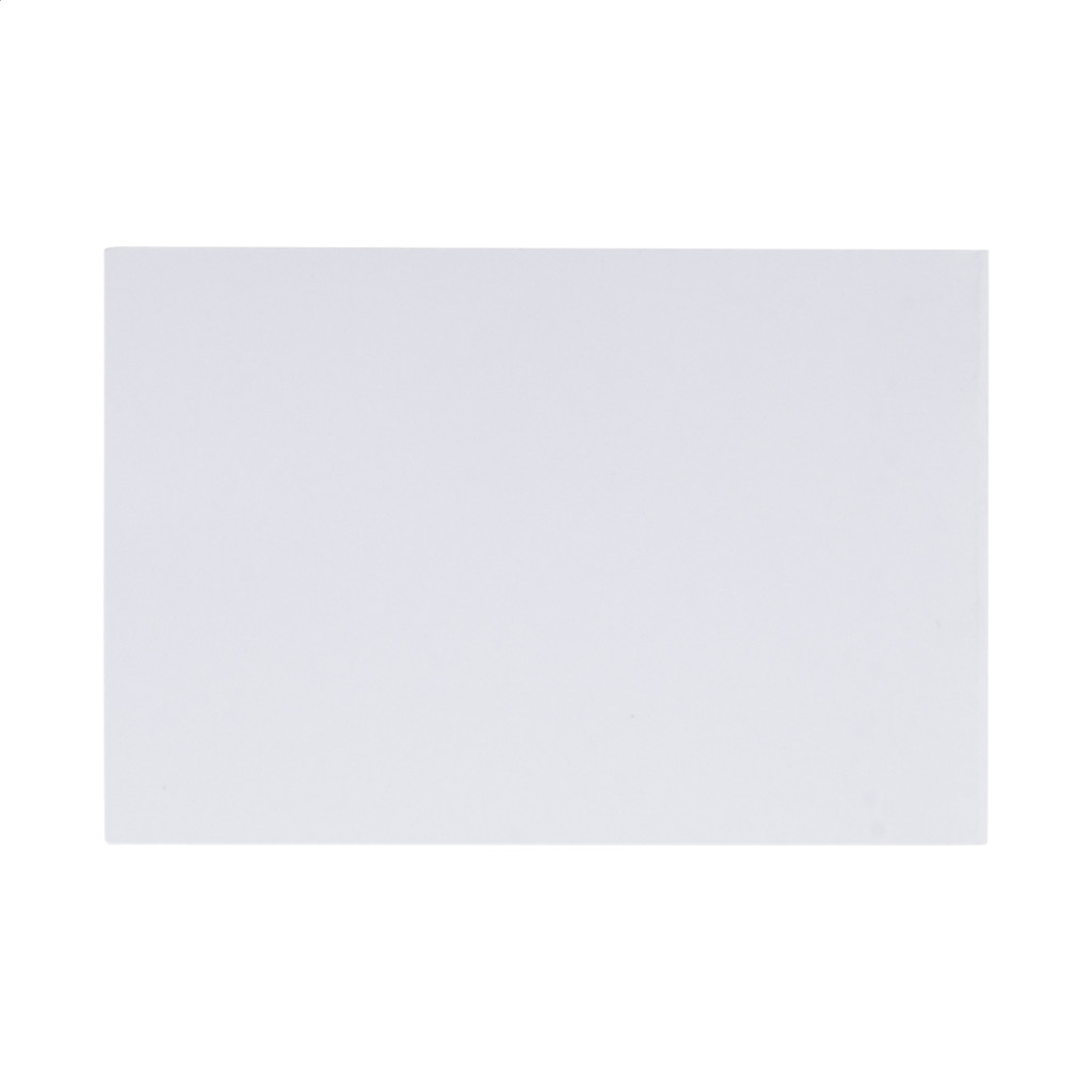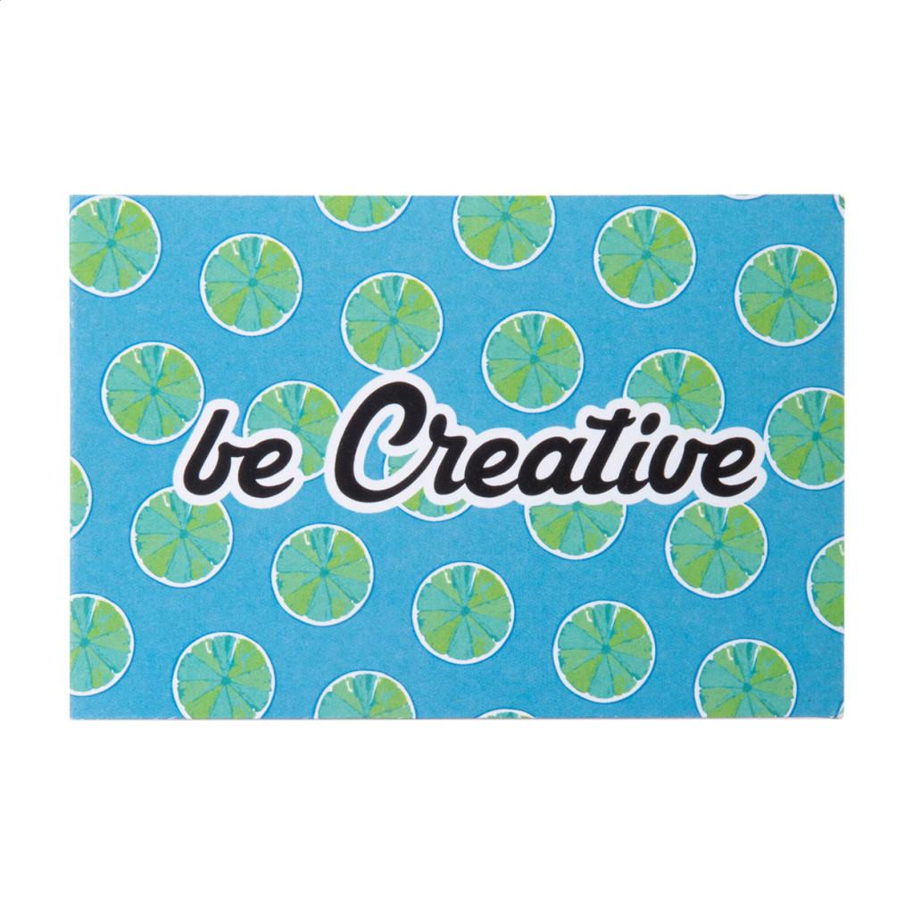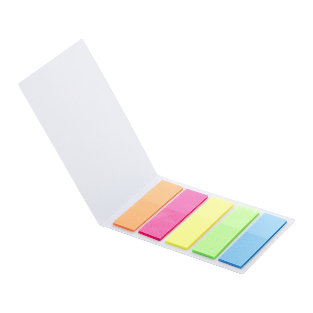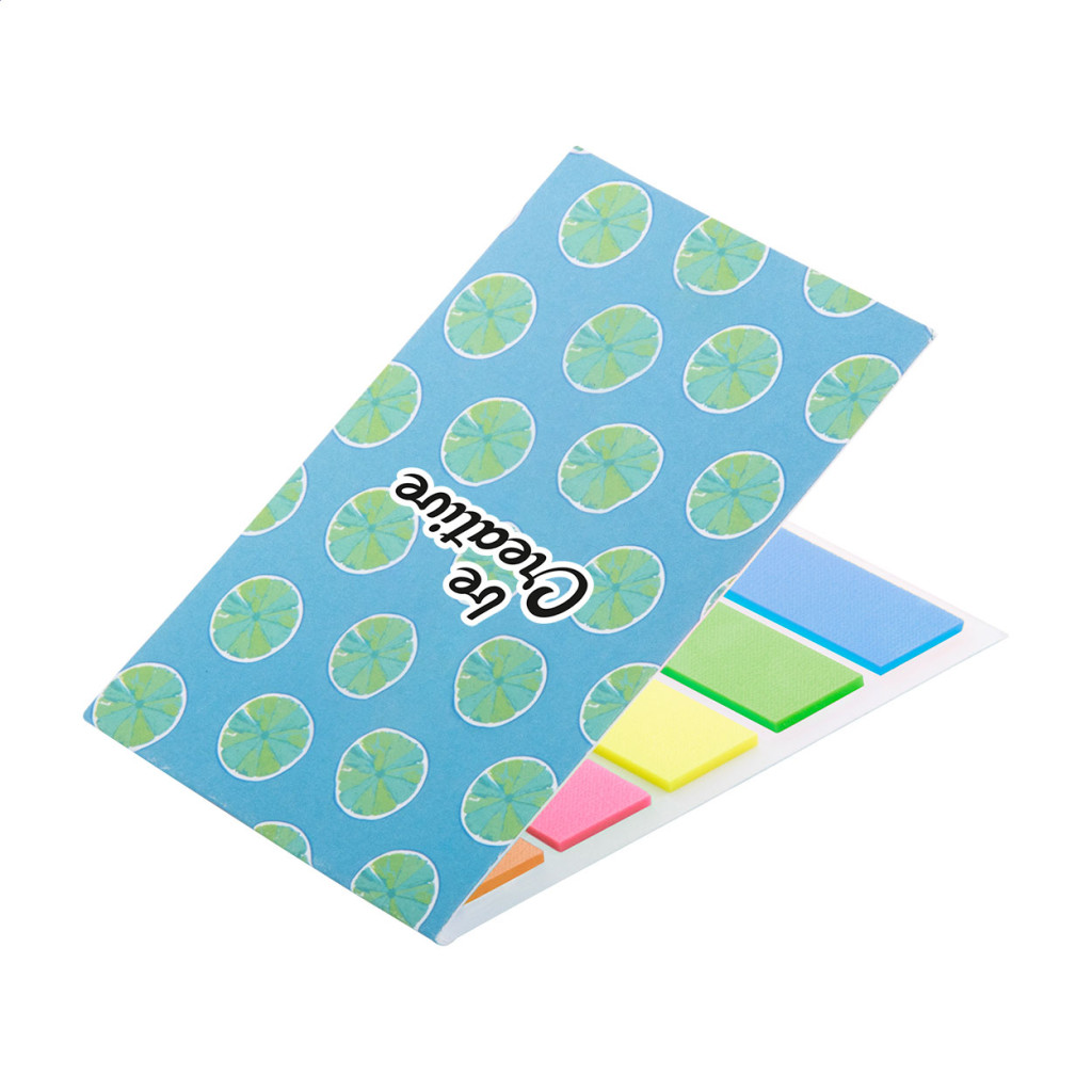 Egyediesíthető, papírral borított öntapadós jegyzettömb. Tartalmaz 100 műanyag fólia oldaljelölőt 5 különböző színben (44×12 mm). Az ár tartalmazza a külső borító full-colour nyomtatását. Minimális rendelési mennyiség: 100 db.
