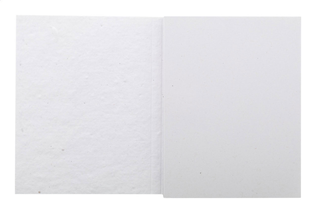 Egyediesíthető, magpapírral borított öntapadós jegyzettömb. Tartalmaz 50 újrahasznosított papír öntapadós jegyzetlapot (100×75 mm). Az ár tartalmazza a külső borító full-colour nyomtatását. Minimális rendelési mennyiség: 100 db. Válogatott vadvirágmagokkal.