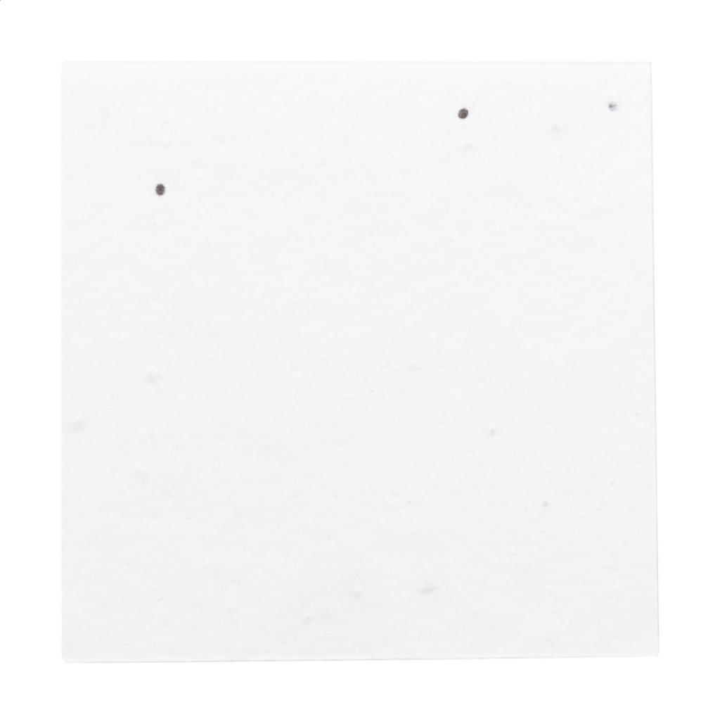 Egyediesíthető, magpapírral borított öntapadós jegyzettömb. Tartalmaz 50 újrahasznosított papír öntapadós jegyzetlapot (75×75 mm). Az ár tartalmazza a külső borító full-colour nyomtatását. Minimális rendelési mennyiség: 100 db. Válogatott vadvirágmagokkal.