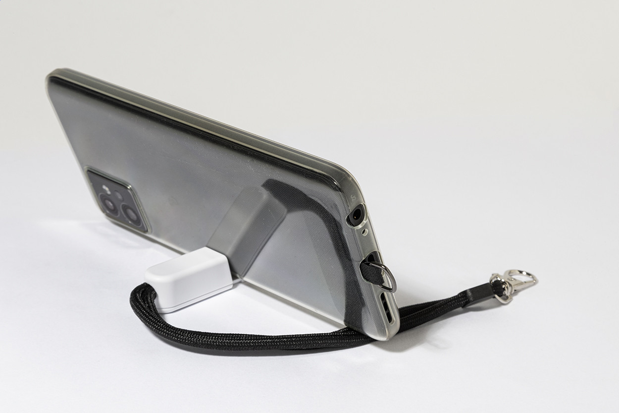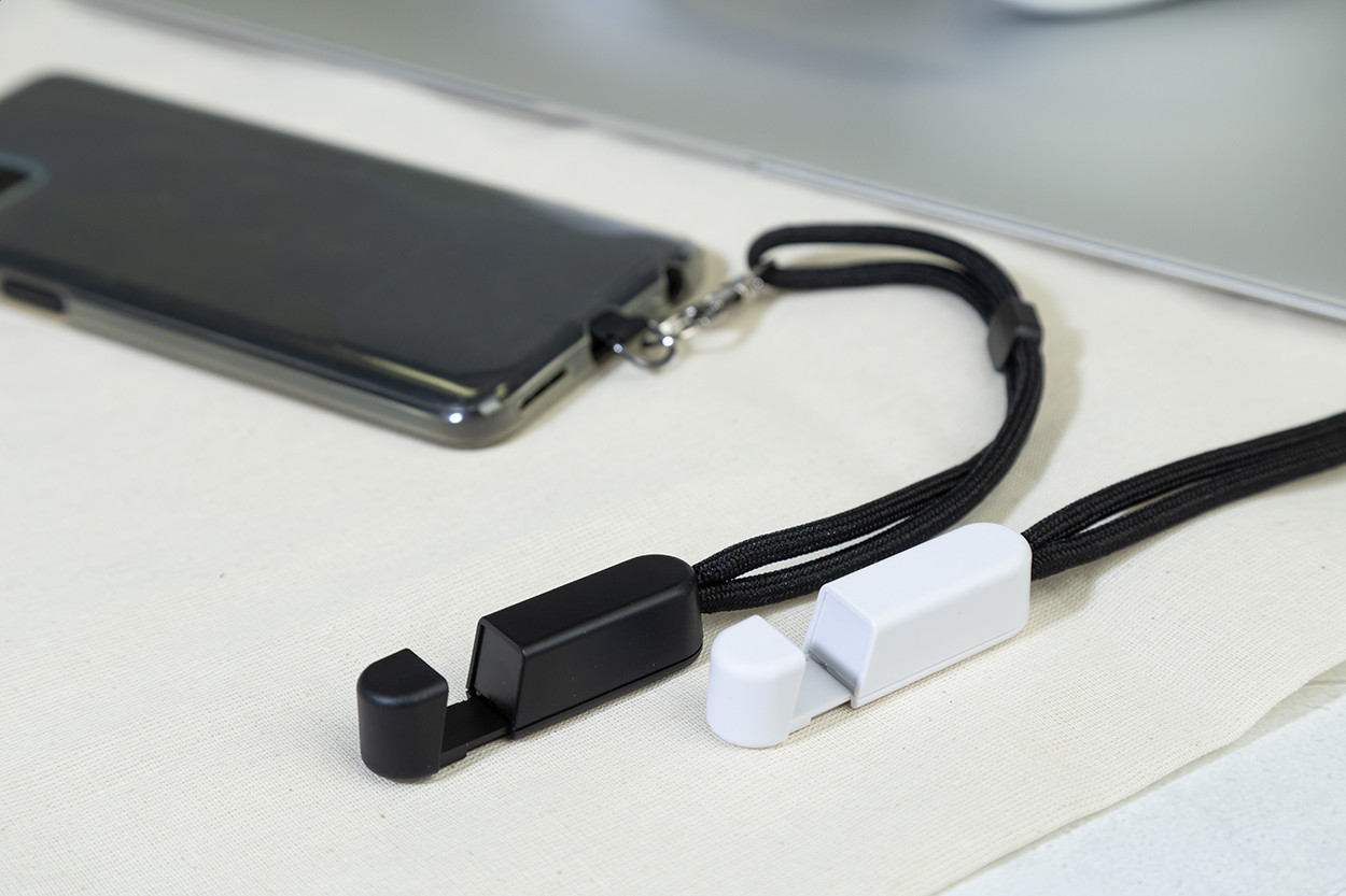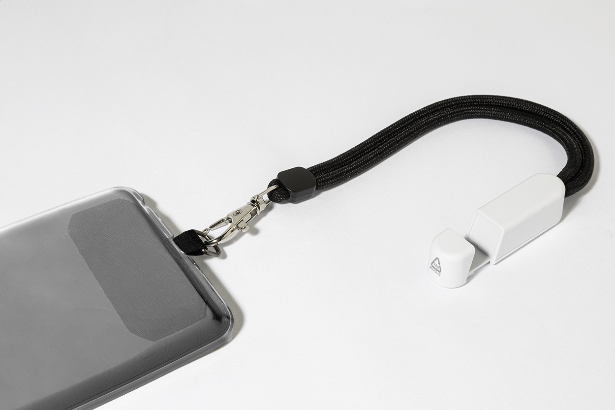 RPET mobiltartó csuklópánt telefonbetéttel és újrahasznosított ABS asztali mobiltartóval.