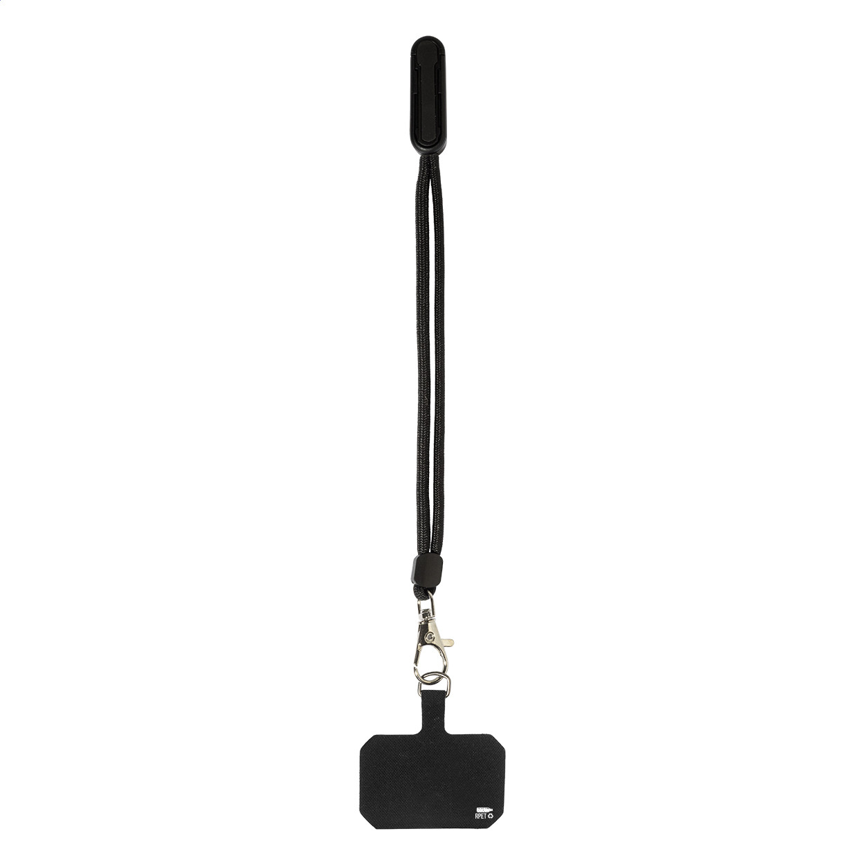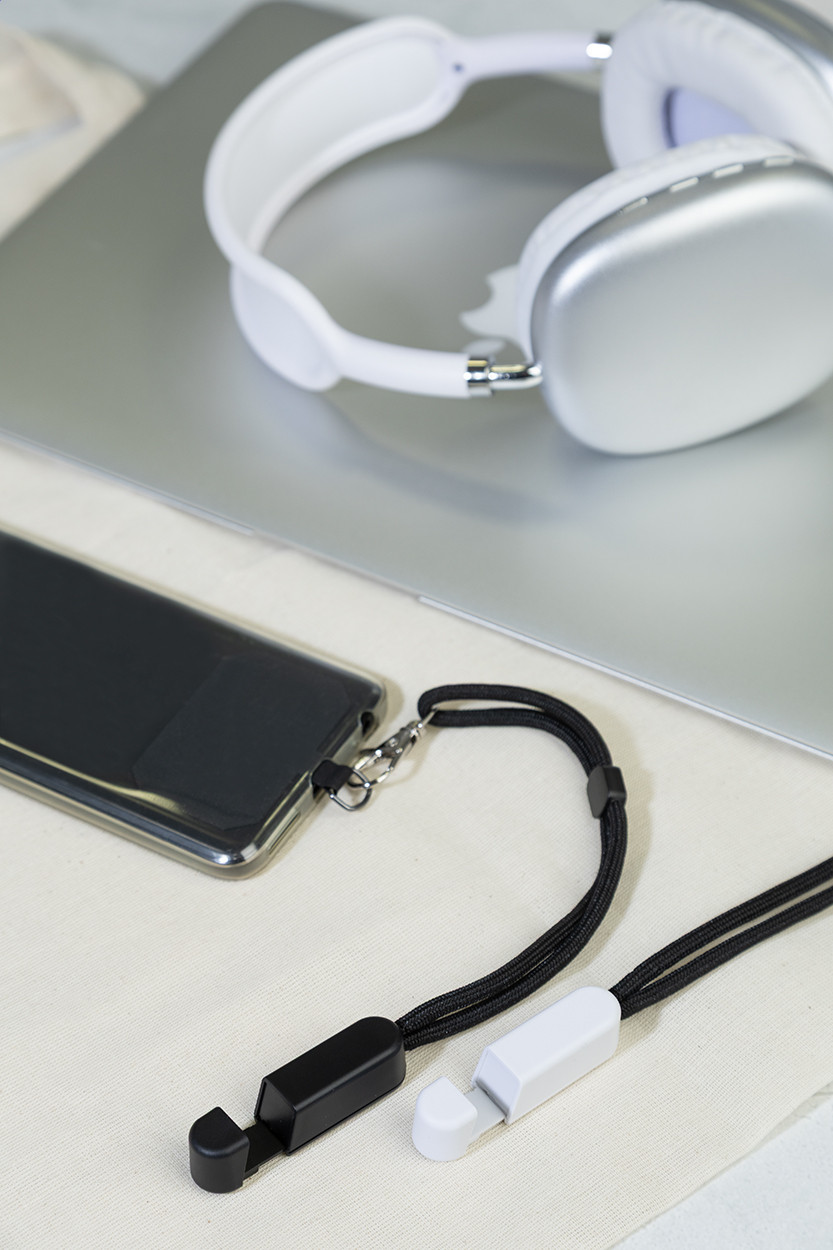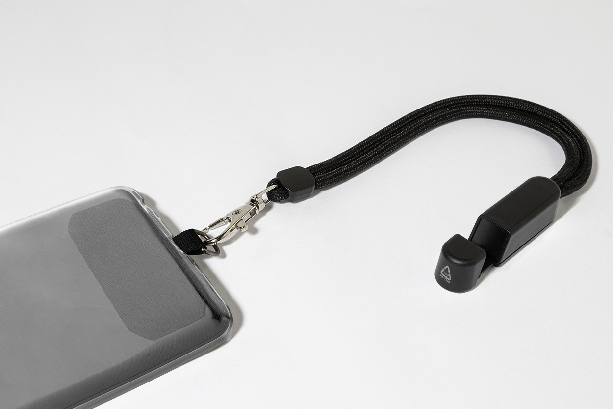 RPET mobiltartó csuklópánt telefonbetéttel és újrahasznosított ABS asztali mobiltartóval.