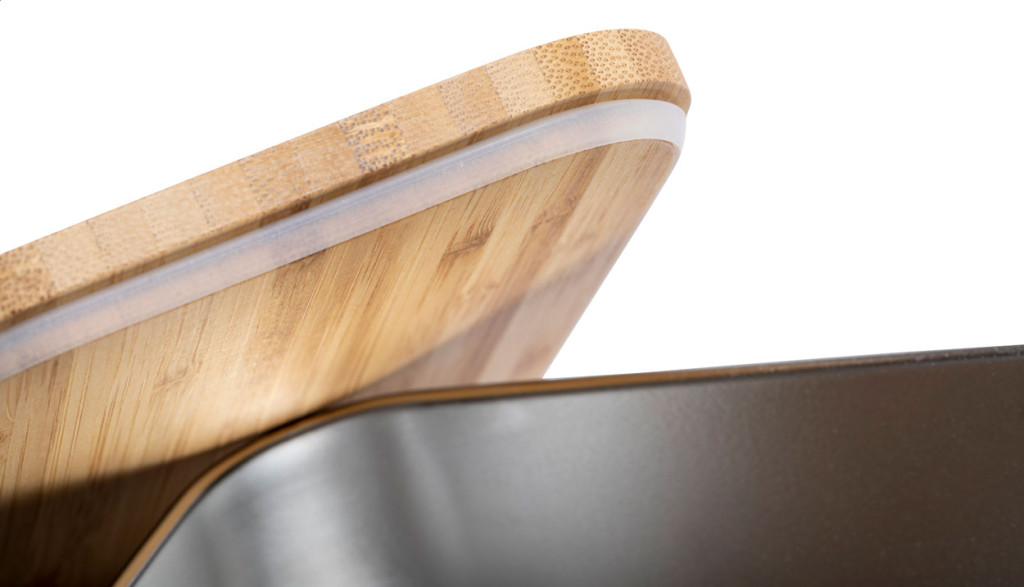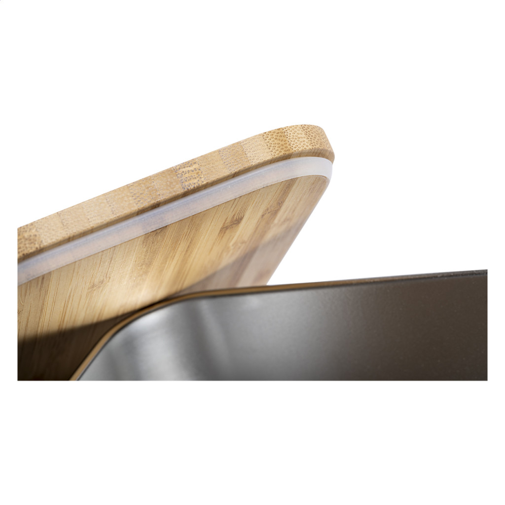 Rozsdamentes acél uzsonnás doboz, természetes bambusz tetővel. Evőeszköz szettel (villa és kanál) és gumipánttal.