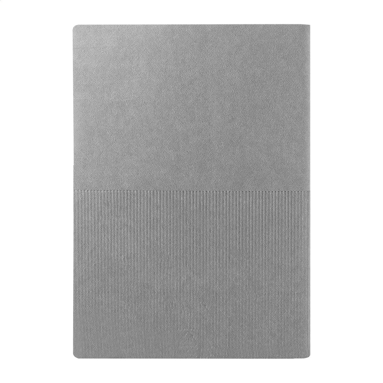 Újrahasznosított műbőr borítású jegyzetfüzet csíkos díszítéssel és fém logózható résszel. Könyvjelzővel és 80 vonalas lappal újrahasznosított papírból. A5-ös méret.