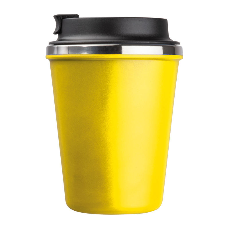 Elegáns, duplafalú vákuumos termosz pohár rozsdamentes acél belsővel és újrahasznosított műanyag külsővel. 350 ml-es űrtartalommal és szivárgásmentes csavaros kupakkal.