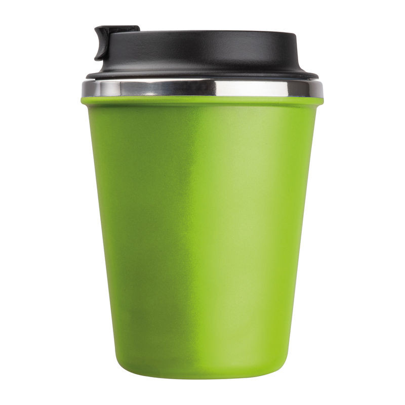Elegáns, duplafalú vákuumos termosz pohár rozsdamentes acél belsővel és újrahasznosított műanyag külsővel. 350 ml-es űrtartalommal és szivárgásmentes csavaros kupakkal.