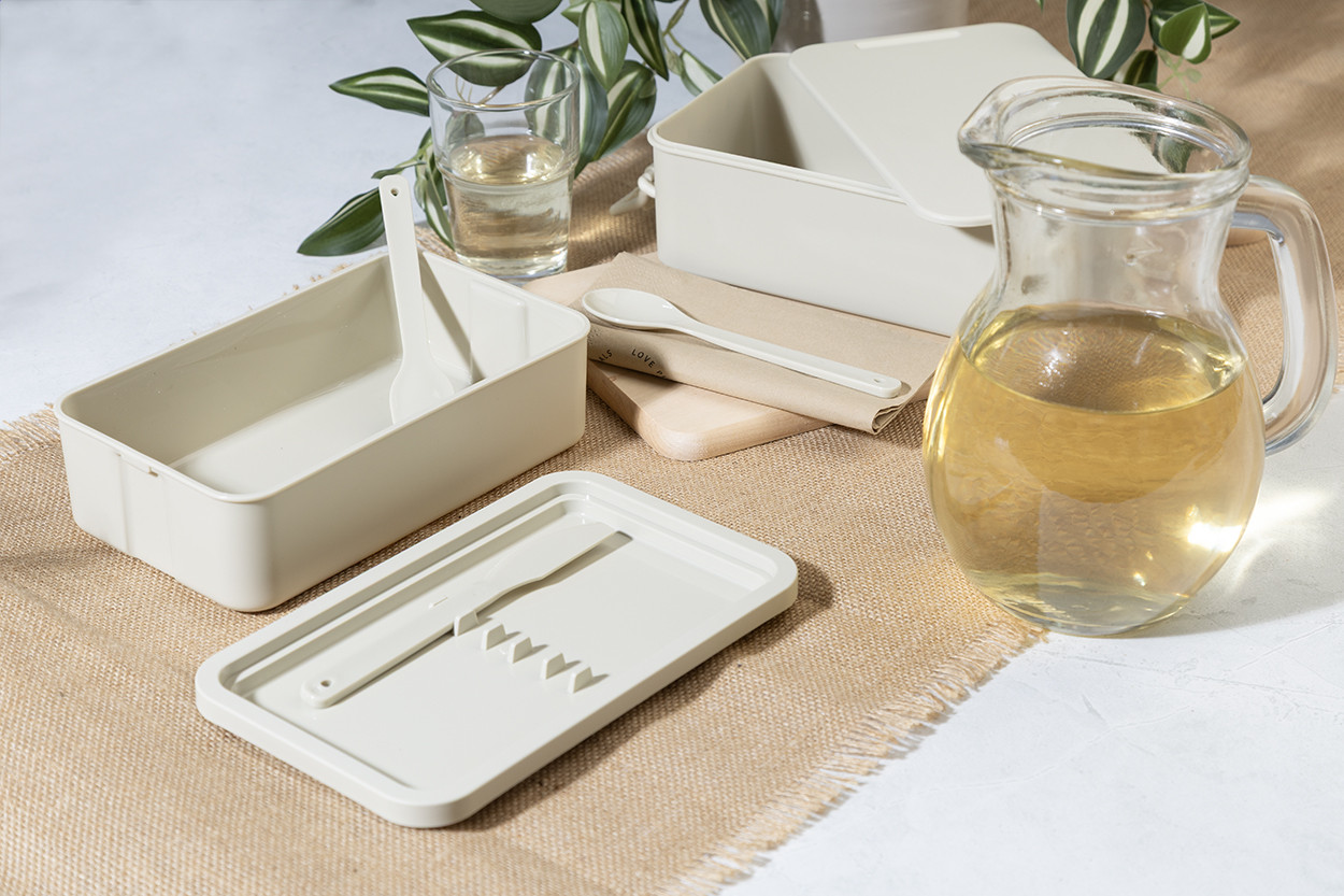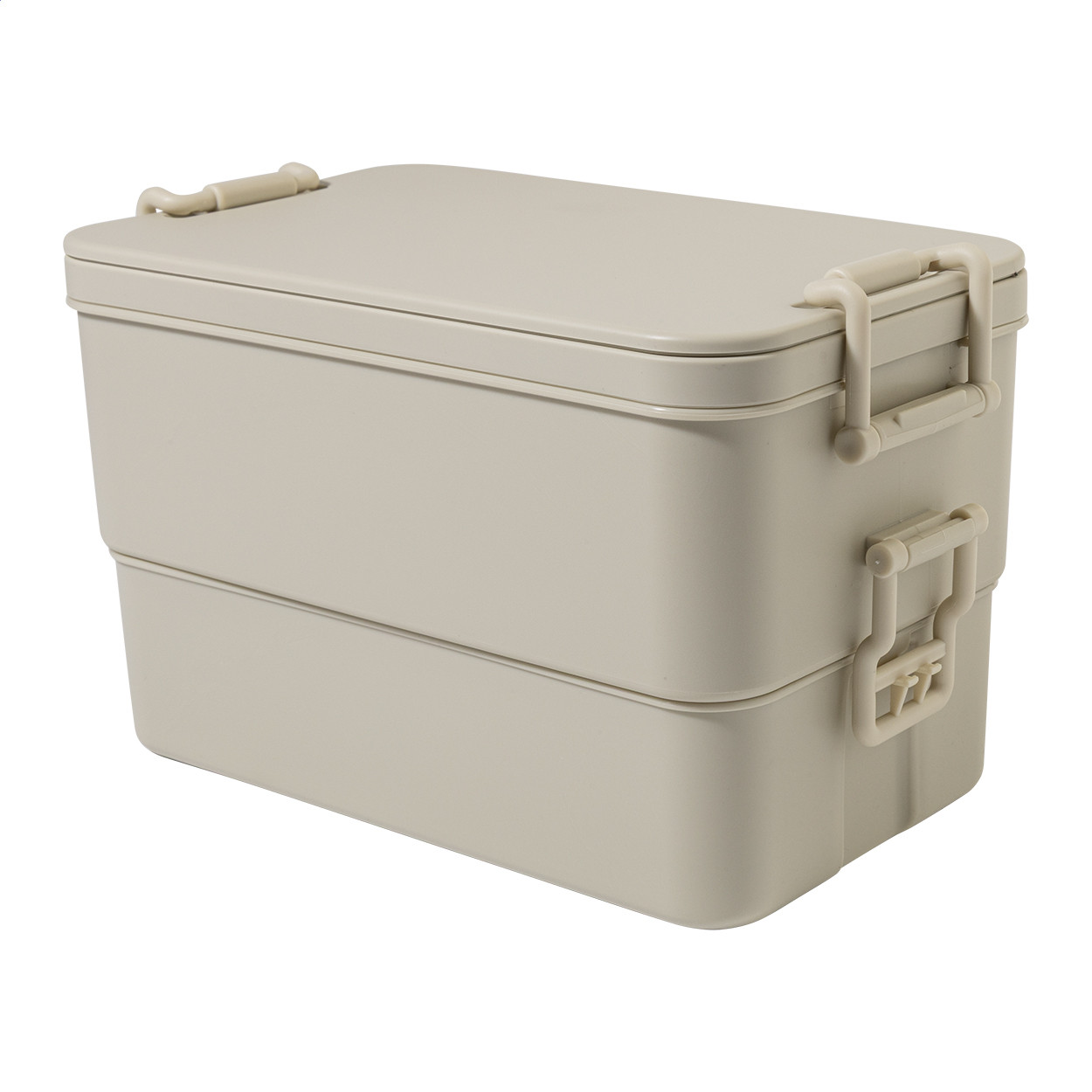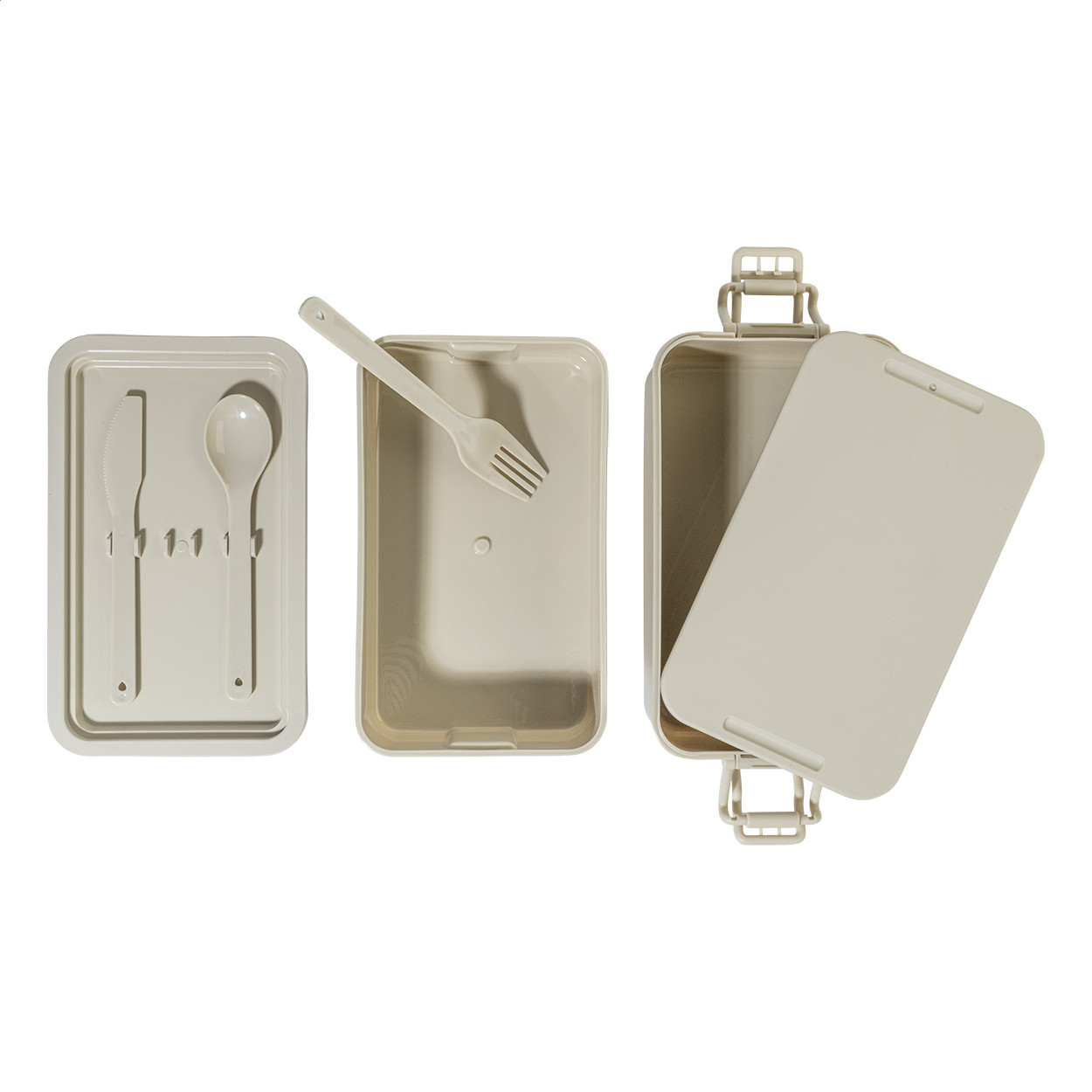 PP műanyag ételdoboz evőeszközkészlettel (villa, kanál és kés), csatos zárral és 2 rekesszel (1000 ml és 800 ml). Egymásra rakható kialakítással a kompakt tárolás érdekében.